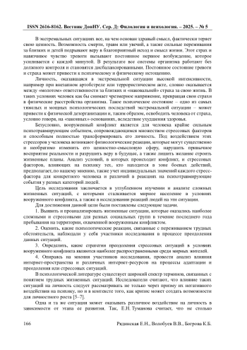 8. Рядинская Е.Н. Исследование эмоциональной сферы гражданских лиц, пострадавших вследствие боевых действий / Е.Н. Рядинская, В.В. Волобуев, М.А. Тахтарова // Современная наука: актуальные проблемы теории и практики“. - 2024. - № 09. - С. 82-85. 10.37882/2500- 3682.2024.09.14. DOI: 10.37882/2500-3682.2024.09.14