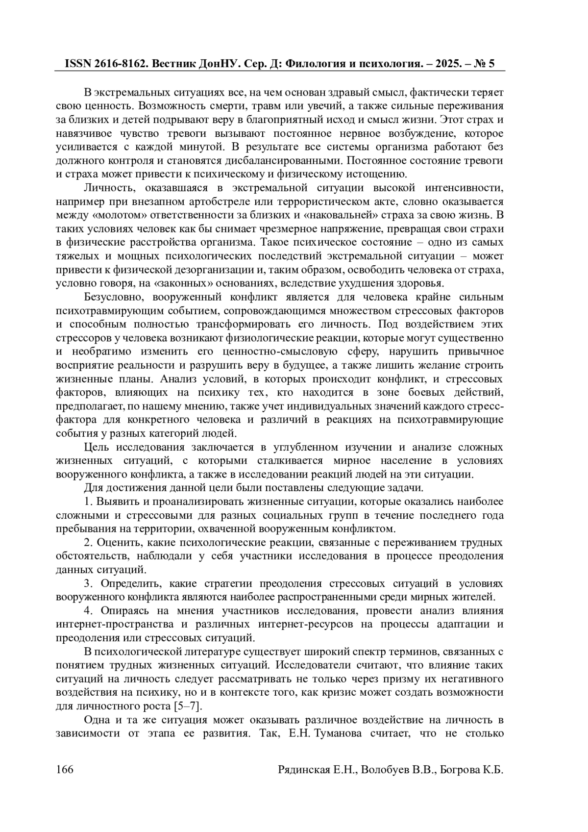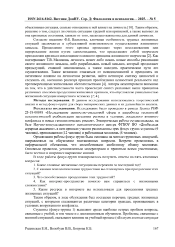 В данной статье представлены результаты исследования по проблеме пребывания в сложных жизненных ситуациях мирных жителей, проживающих в зоне вооруженного конфликта. Эмпирические сведения были получены с помощью метода фокус-групп по трем категориям населения: студенты (фокус-группа 1), работающая молодежь (фокус-группа 2), работники образования и преподаватели (фокус-группа 3). Выяснено, что в целом справиться с негативными состояниями участникам всех групп помогает осознание того, что человек не одинок, занятия любимым делом, работа и общение с коллегами, физические нагрузки, поддержка семьи, частое общение в социальных сетях и мессенджерах, уход за животными, что является ценным для людей в тяжелый период вооруженного конфликта. Полученные данные в перспективе дальнейших исследований будут положены в основу опросника.