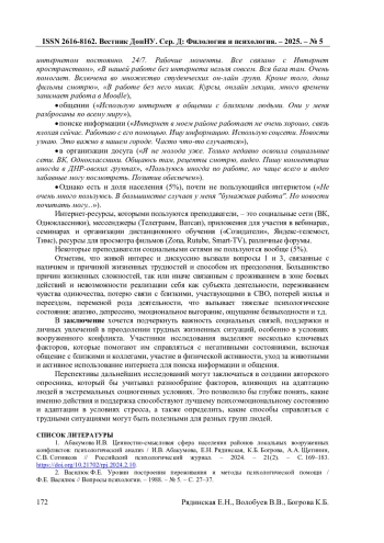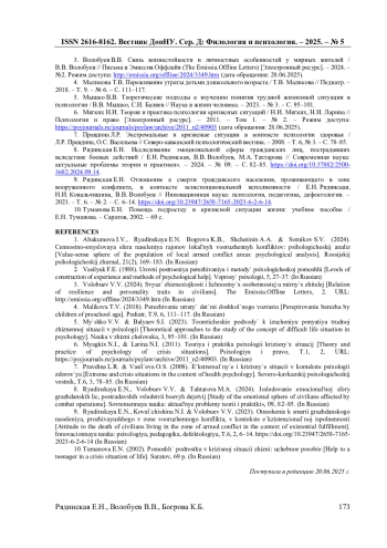 3. Волобуев В.В. Связь жизнестойкости и личностных особенностей у мирных жителей / В.В. Волобуев // Письма в Эмиссия.Оффлайн (The Emissia.Offline Letters) [Электронный ресурс]. - 2024. - №2. Режим доступа: http://emissia.org/offline/2024/3349.htm (дата обращения: 28.06.2025).