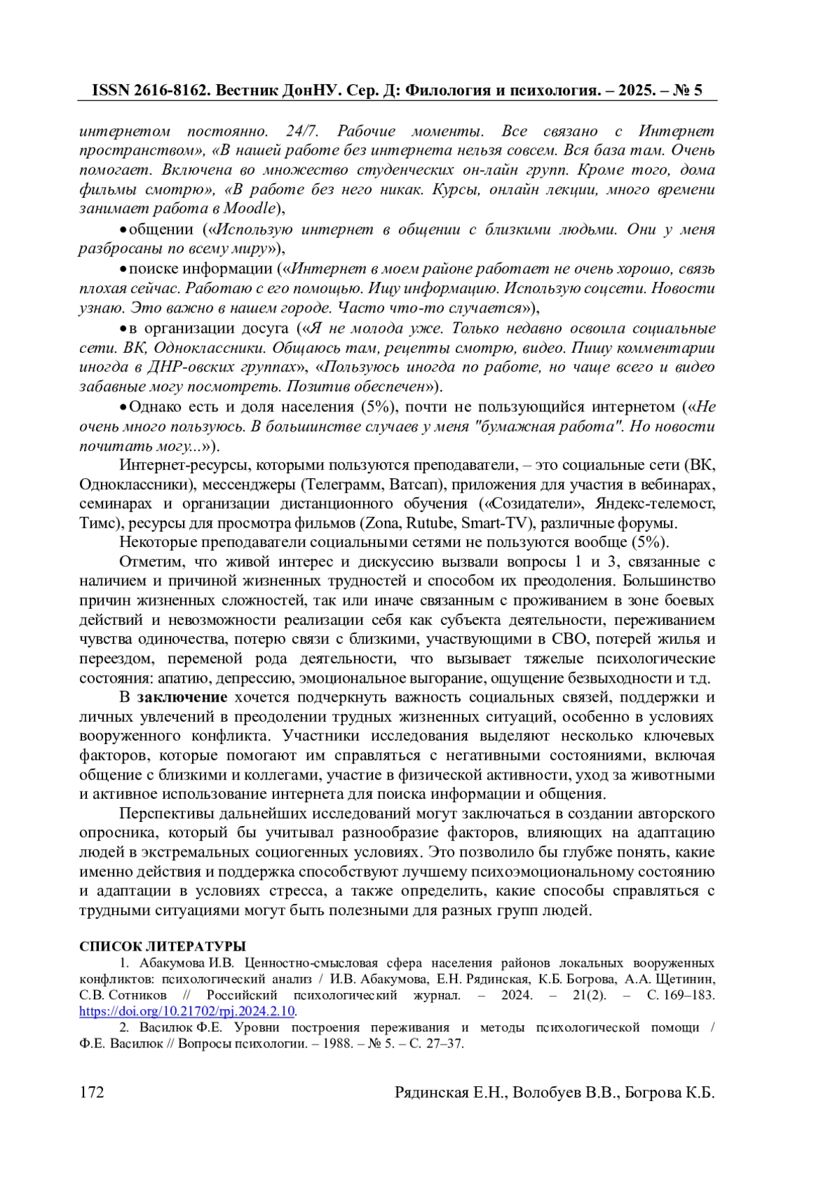1. Абакумова И.В. Ценностно-смысловая сфера населения районов локальных вооруженных конфликтов: психологический анализ / И.В. Абакумова, Е.Н. Рядинская, К.Б. Богрова, А.А. Щетинин, С.В. Сотников // Российский психологический журнал. - 2024. - 21(2). - С. 169-183. DOI: 10.21702/rpj.2024.2.10 EDN: QJUSWU