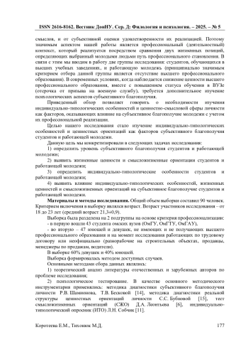 В статье представлен анализ уровня и компонентов субъективного благополучия современной молодежи с учетом сферы занятости, а также факторов, оказывающих влияние на благополучие/неблагополучие личности. В качестве основных факторов рассматриваются индивидуально-типологические особенности (экстраверсия, тревожность, ригидность и др.), смысложизненные ориентации и жизненные ценности. В исследовании приняли участие 90 человек в возрасте от 18 до 23 лет. Основные методы сбора данных: теоретический анализ литературы отечественных и зарубежных авторов по проблеме исследования, психологическое тестирование (методика диагностики субъективного благополучия личности Р. В. Шамионова, Т. В. Бесковой, методика диагностики реальной структуры ценностных ориентаций личности С. С. Бубновой, тест смысложизненных ориентаций (СЖО) Д. А. Леонтьева, индивидуально-типологический опросник (ИТО) Л. Н. Собчик). Анализ результатов исследования показал, что индивидуально-типологические особенности и ценностные ориентации являются факторами субъективного благополучия студентов и работающей молодежи. У студентов в качестве факторов субъективного благополучия выступают как индивидуально-типологические особенности, так и жизненные ценности и смыслы, а у работающей молодежи ведущим фактором субъективного благополучия являются смысложизненные ориентации.