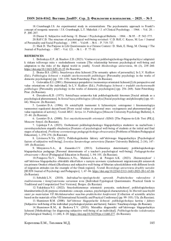 1. Белинская Е.П. Взаимосвязь психологического благополучия и адаптации к рискам цифрового мира в молодежном возрасте / Е.П. Белинская, З.Д. Шаехов // Вестник Московского университета. - 2023. - Т. 46. - № 3. - С. 239-260. -. DOI: 10.11621/LPJ-23-35 EDN: FKJOXF