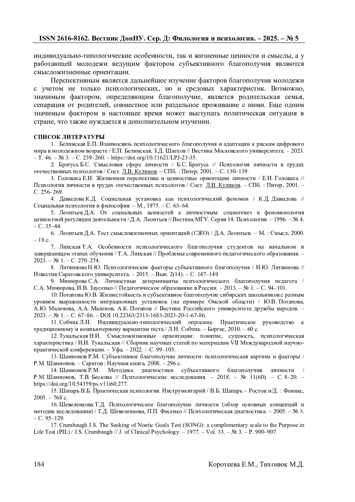 7. Липская Т.А. Особенности психологического благополучия студентов на начальном и завершающем этапах обучения / Т.А. Липская // Проблемы современного педагогического образования. - 2023. - № 1. - С. 270-274. EDN: CQRITC