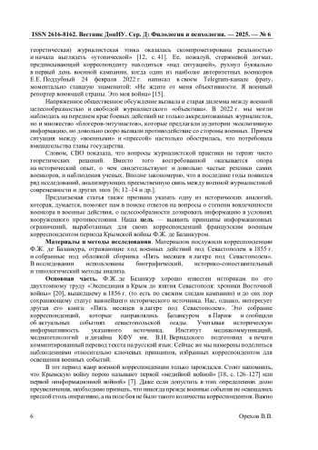 10. Орехова Л.А. От “Солдатского вестника” - к “Военному листку”: эволюция идеи издания в условиях Крымской войны (1854 г.) Л.А. Орехова, Д.К. Первых // Ученые записки Крымского федерального университета имени В.И. Вернадского. Филологические науки. - 2021. - Т. 7. - № 4. - С. 189-206.