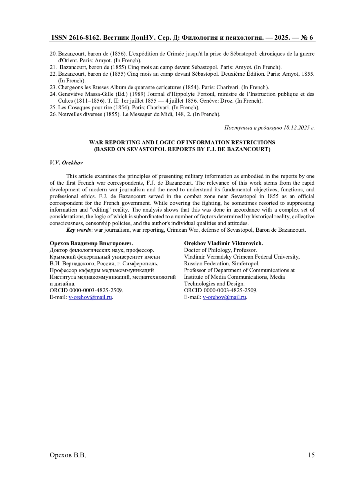 8. Орехов В.В. Барон де Базанкур: литератор, историк, военный корреспондент. Часть VI. Вторая республика: политическая реальность и литература / В.В. Орехов // Ученые записки Крымского федерального университета имени В.И. Вернадского. Филологические науки. - 2025. - Т. 11. - № 1. - С. 38-54.