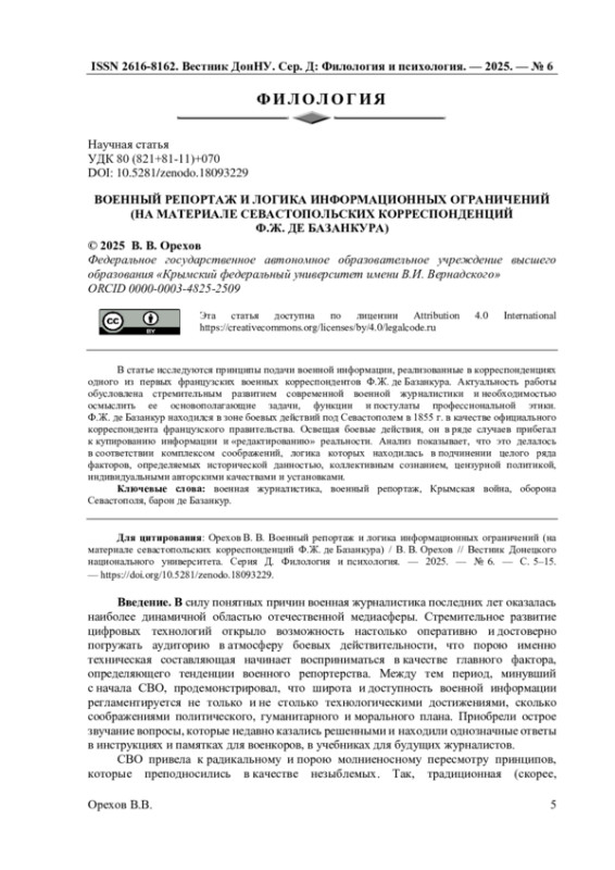 В статье исследуются принципы подачи военной информации, реализованные в корреспонденциях одного из первых французских военных корреспондентов Ф. Ж. де Базанкура. Актуальность работы обусловлена стремительным развитием современной военной журналистики и необходимостью осмыслить ее основополагающие задачи, функции и постулаты профессиональной этики. Ф. Ж. де Базанкур находился в зоне боевых действий под Севастополем в 1855 г. в качестве официального корреспондента французского правительства. Освещая боевые действия, он в ряде случаев прибегал к купированию информации и «редактированию» реальности. Анализ показывает, что это делалось в соответствии комплексом соображений, логика которых находилась в подчинении целого ряда факторов, определяемых исторической данностью, коллективным сознанием, цензурной политикой, индивидуальными авторскими качествами и установками.