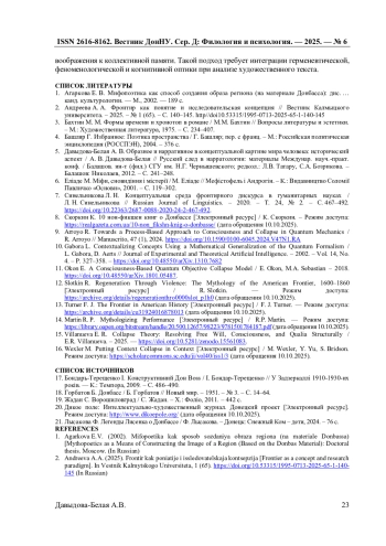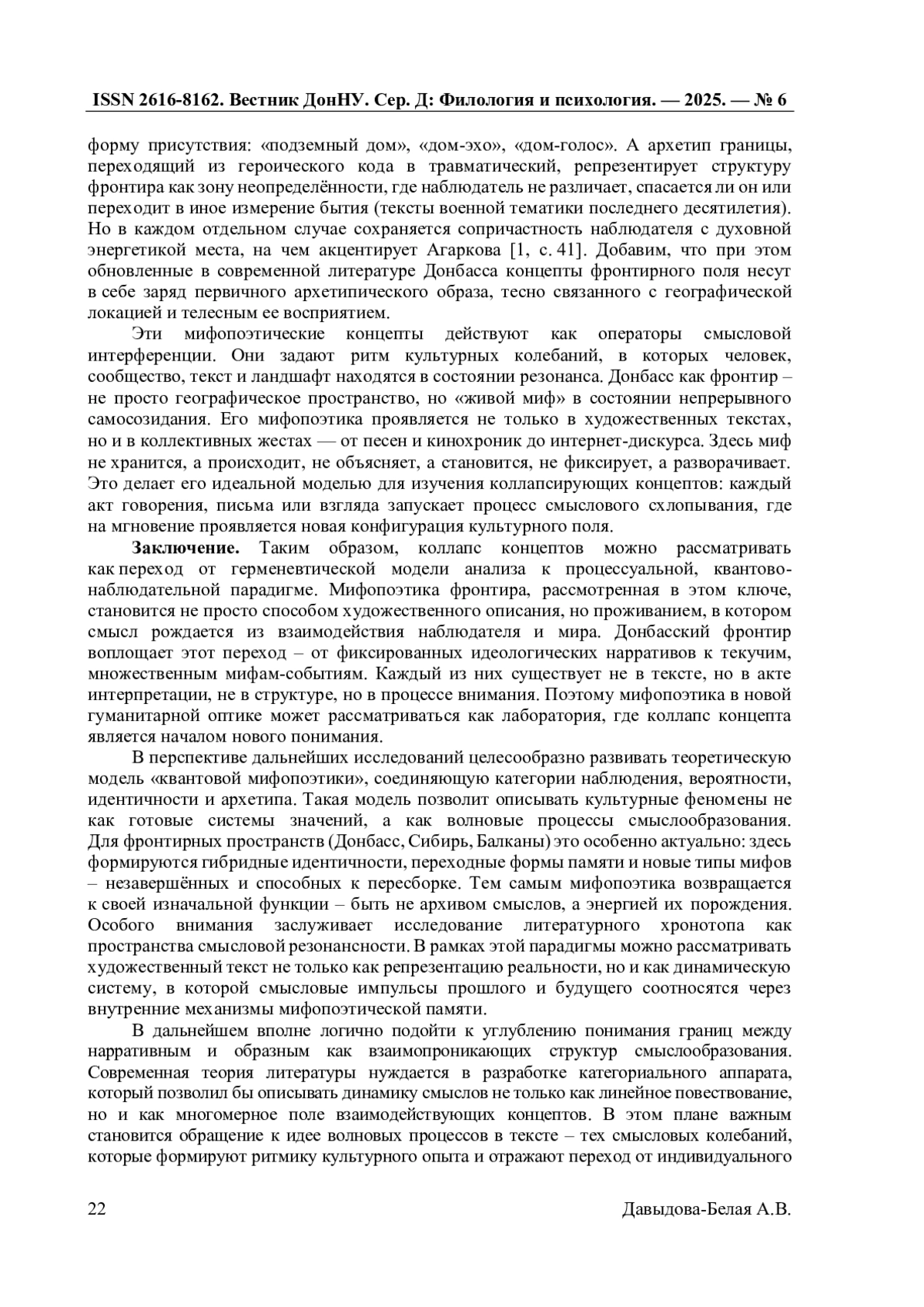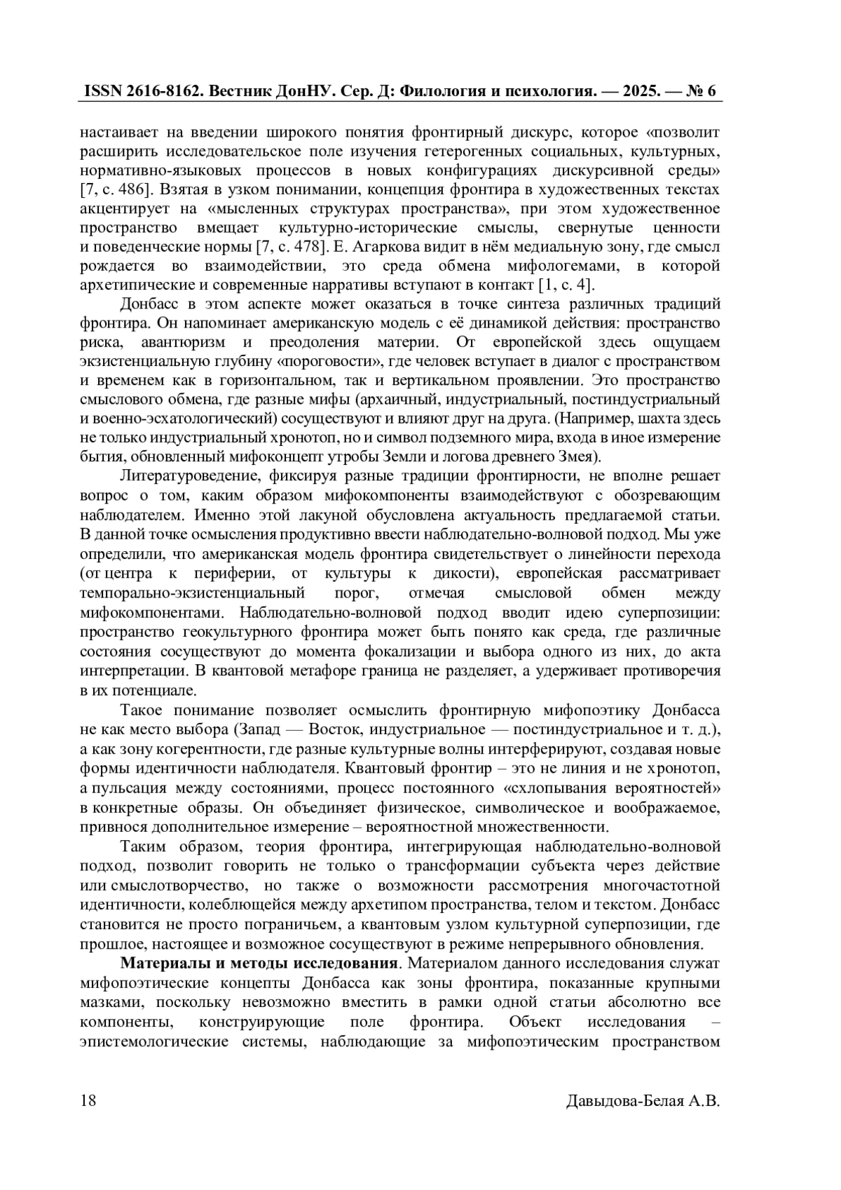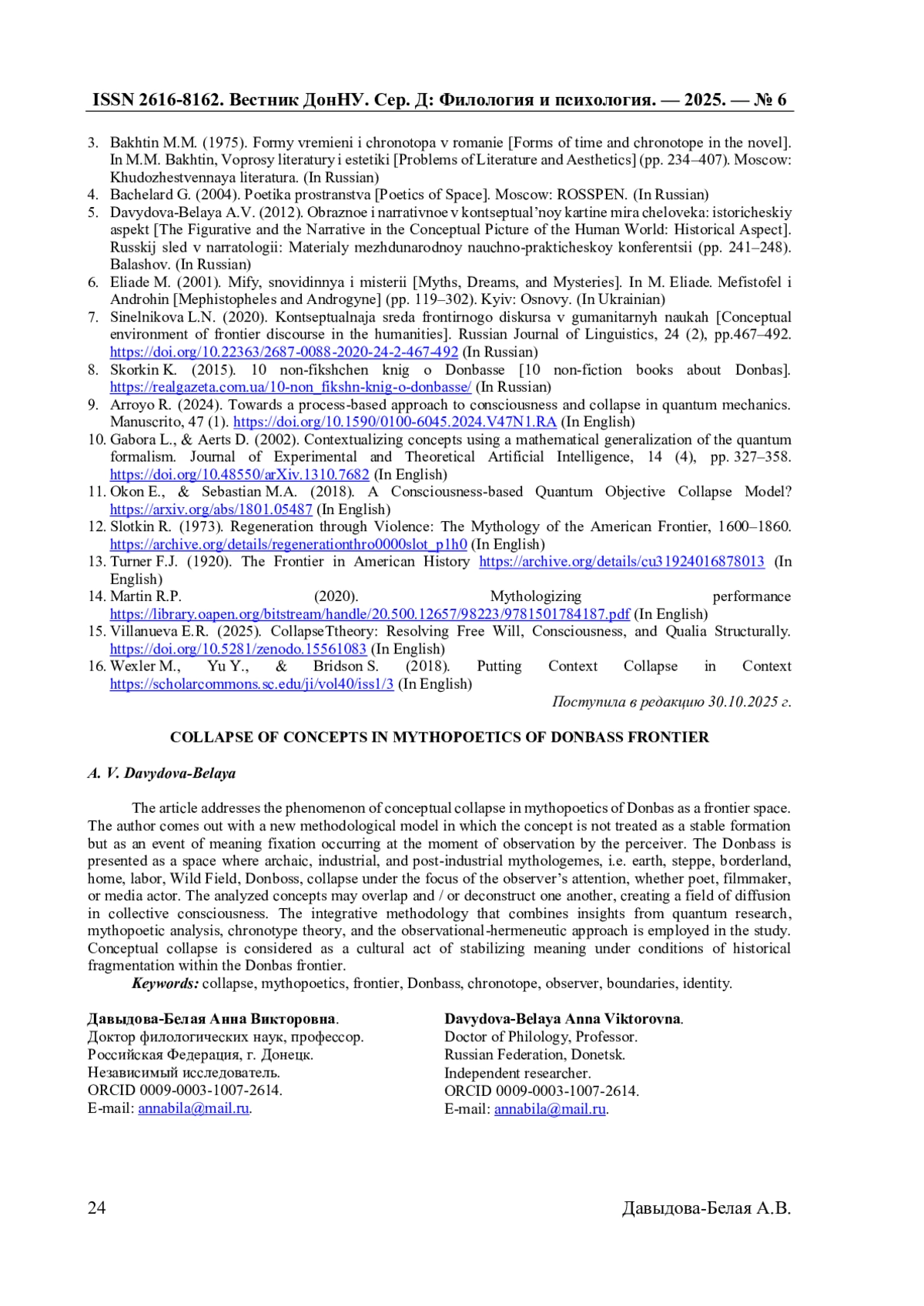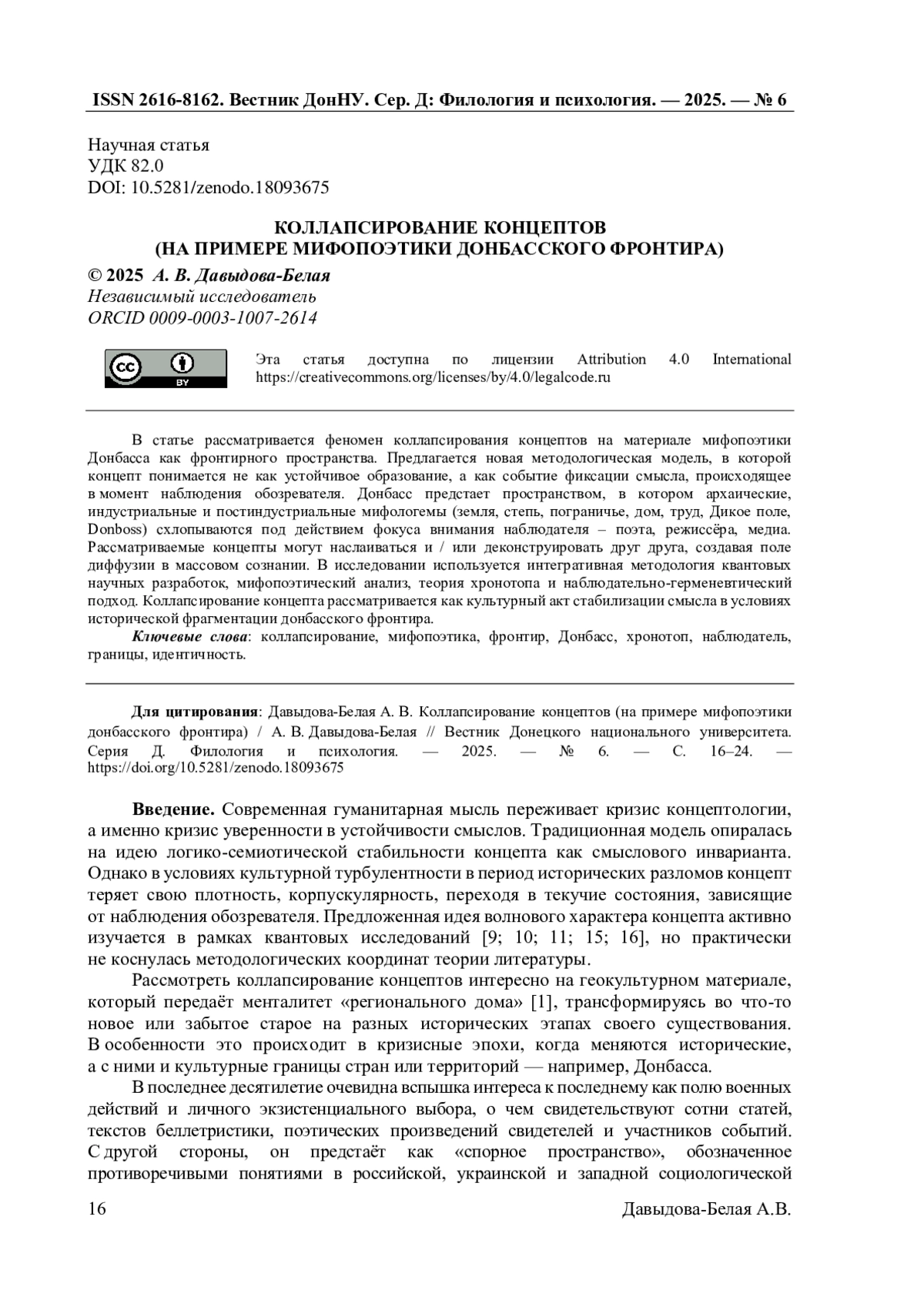 В статье рассматривается феномен коллапсирования концептов на материале мифопоэтики Донбасса как фронтирного пространства. Предлагается новая методологическая модель, в которой концепт понимается не как устойчивое образование, а как событие фиксации смысла, происходящее в момент наблюдения обозревателя. Донбасс предстает пространством, в котором архаические, индустриальные и постиндустриальные мифологемы (земля, степь, пограничье, дом, труд, Дикое поле, Donboss) схлопываются под действием фокуса внимания наблюдателя - поэта, режиссёра, медиа. Рассматриваемые концепты могут наслаиваться и / или деконструировать друг друга, создавая поле диффузии в массовом сознании. В исследовании используется интегративная методология квантовых научных разработок, мифопоэтический анализ, теория хронотопа и наблюдательно-герменевтический подход. Коллапсирование концепта рассматривается как культурный акт стабилизации смысла в условиях исторической фрагментации донбасского фронтира.