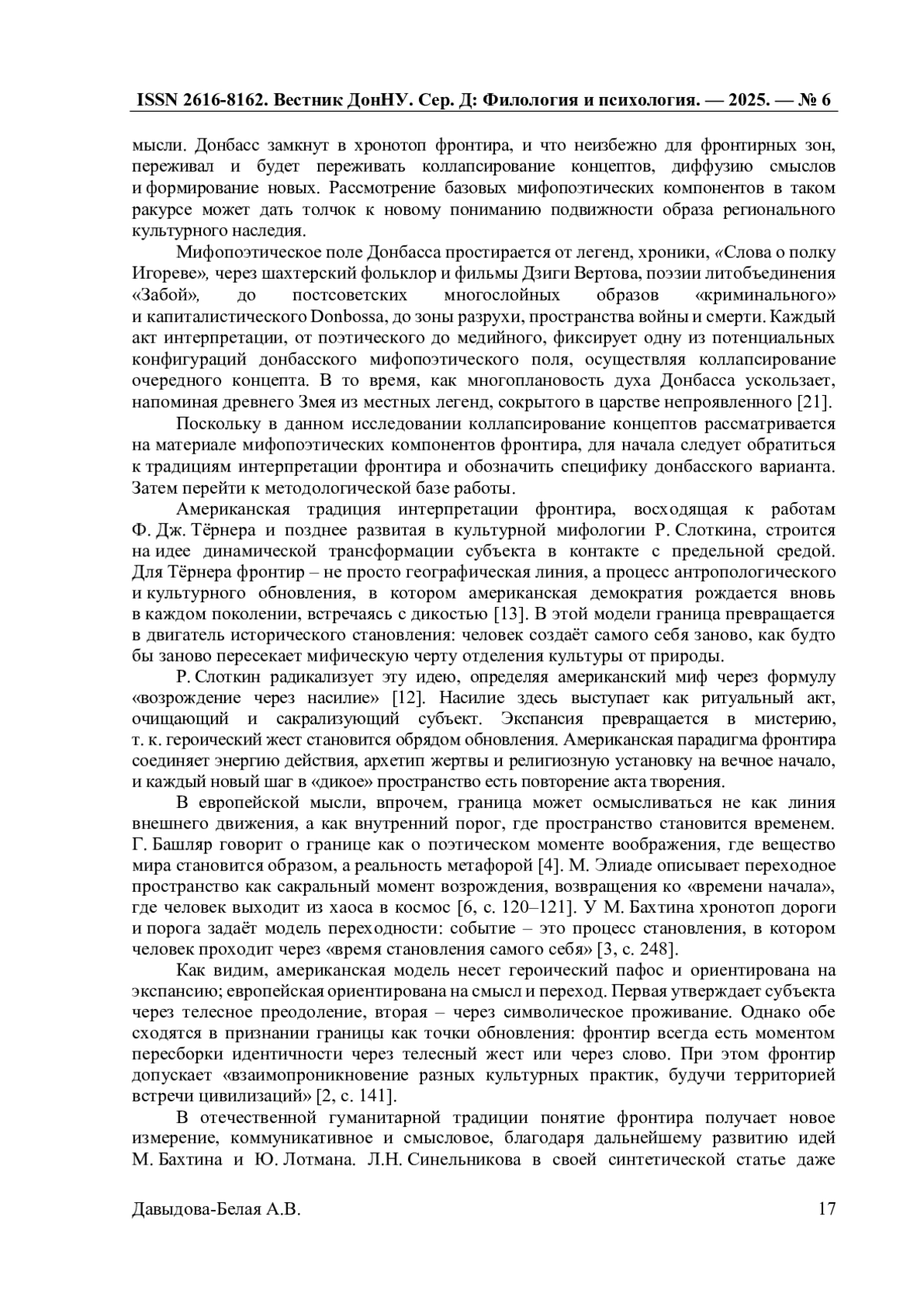 7. Синельникова Л. Н. Концептуальная среда фронтирного дискурса в гуманитарных науках / Л. Н. Синельникова // Russian Journal of Linguistics. - 2020. - Т. 24, № 2. - С. 467-492. DOI: 10.22363/2687-0088-2020-24-2-467-492