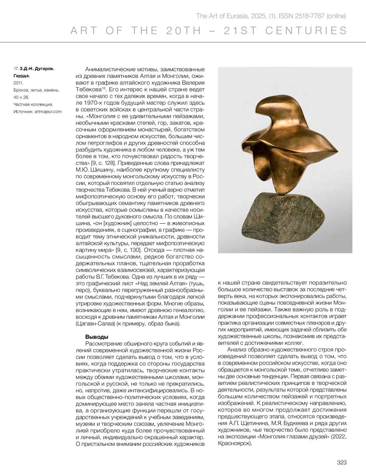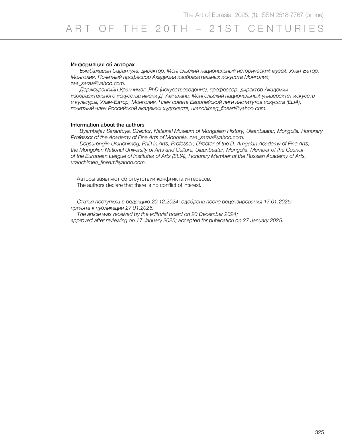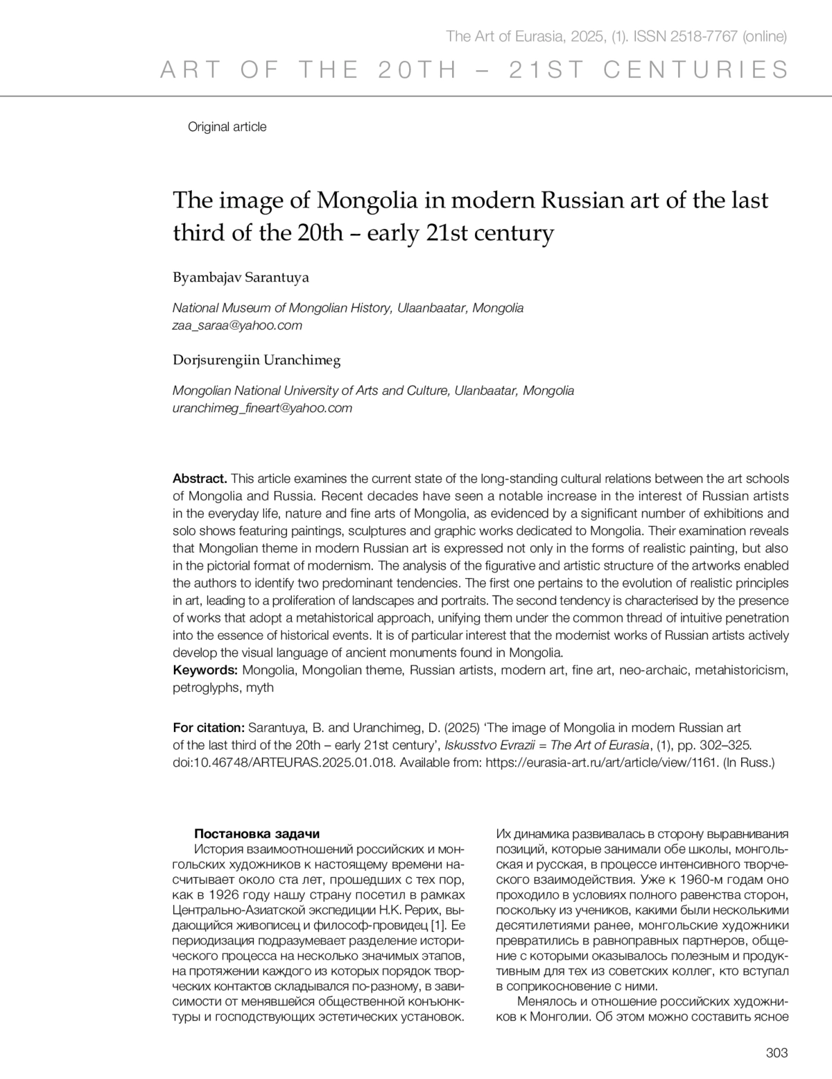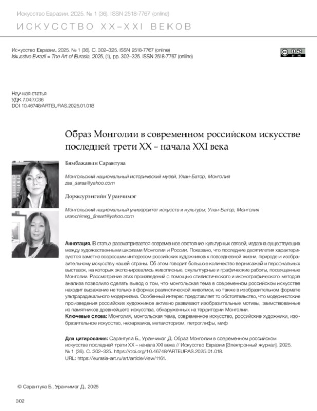 Сарантуяа Б., Уранчимэг Д. Образ Монголии в современном российском искусстве последней трети XX – начала XXI века // Искусство Евразии [Электронный журнал]. 2025. No 1 (36). С. 302–325. https://doi.org/10.46748/ARTEURAS.2025.01.018.