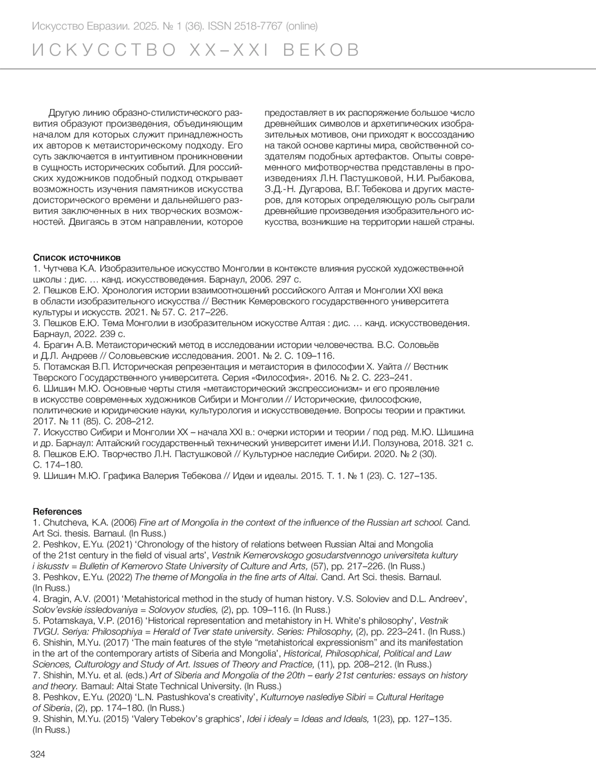 6. Shishin, M.Yu. (2017) ‘The main features of the style “metahistorical expressionism” and its manifestation in the art of the contemporary artists of Siberia and Mongolia’, *Historical, Philosophical, Political and Law Sciences, Culturology and Study of Art. Issues of Theory and Practice*, (11), pp. 208–212. (In Russ.)