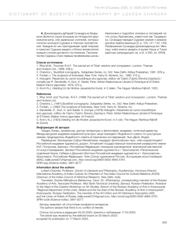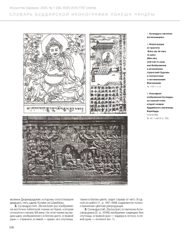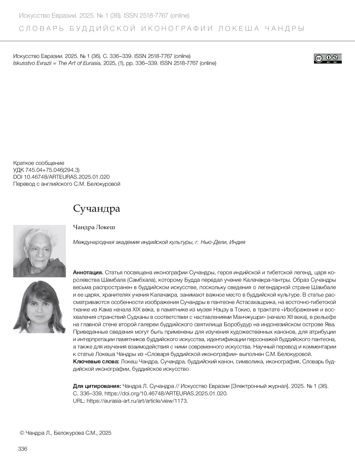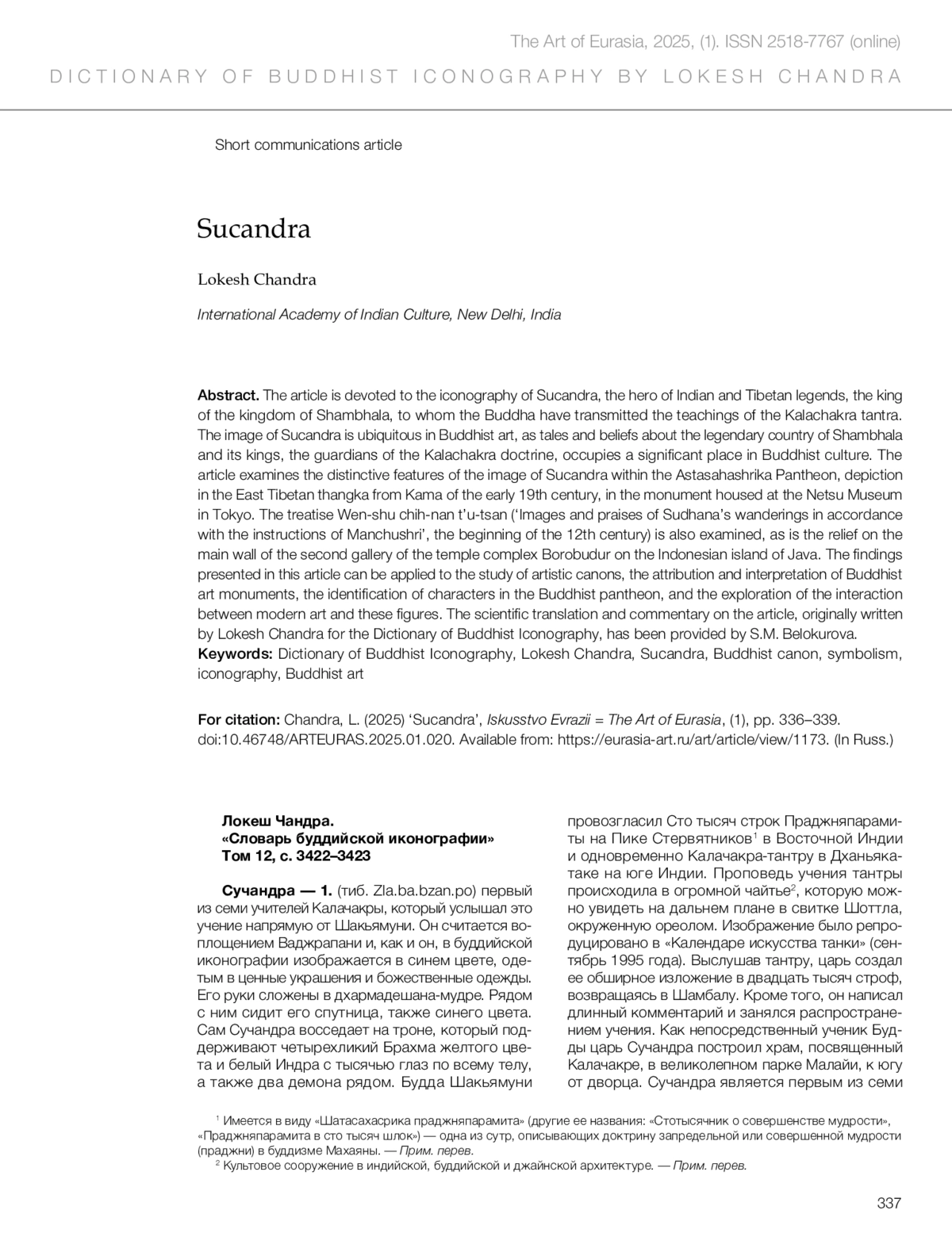 The article is devoted to the iconography of Sucandra, the hero of Indian and Tibetan legends, the king of the kingdom of Shambhala, to whom the Buddha have transmitted the teachings of the Kalachakra tantra. The image of Sucandra is ubiquitous in Buddhist art, as tales and beliefs about the legendary country of Shambhala and its kings, the guardians of the Kalachakra doctrine, occupies a significant place in Buddhist culture. The article examines the distinctive features of the image of Sucandra within the Astasahashrika Pantheon, depiction in the East Tibetan thangka from Kama of the early 19th century, in the monument housed at the Netsu Museum in Tokyo. The treatise Wen-shu chih-nan t’u-tsan (‘Images and praises of Sudhana’s wanderings in accordance with the instructions of Manchushri’, the beginning of the 12th century) is also examined, as is the relief on the main wall of the second gallery of the temple complex Borobudur on the Indonesian island of Java. The findings presented in this article can be applied to the study of artistic canons, the attribution and interpretation of Buddhist art monuments, the identification of characters in the Buddhist pantheon, and the exploration of the interaction between modern art and these figures. The scientific translation and commentary on the article, originally written by Lokesh Chandra for the Dictionary of Buddhist Iconography, has been provided by S. M. Belokurova.