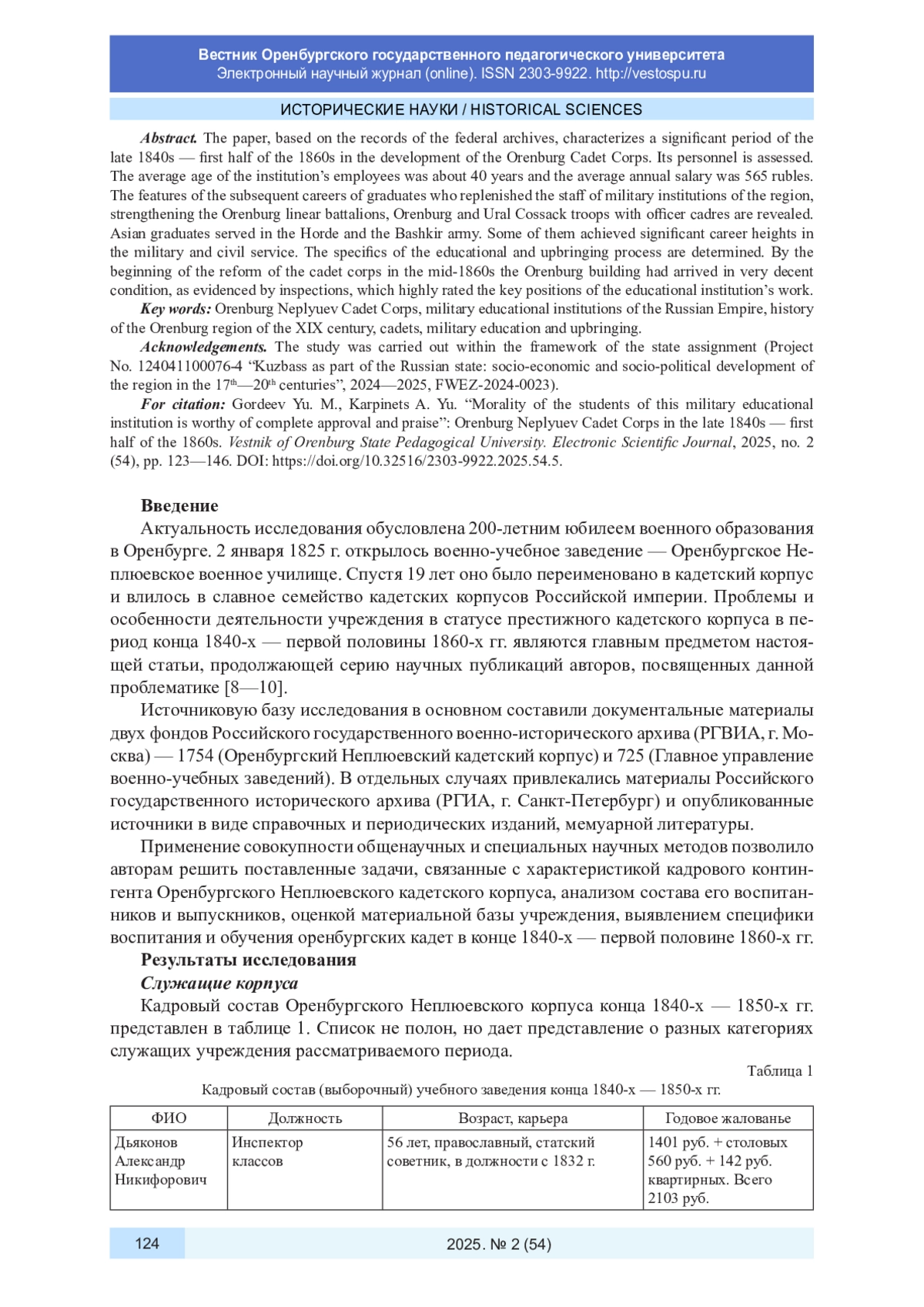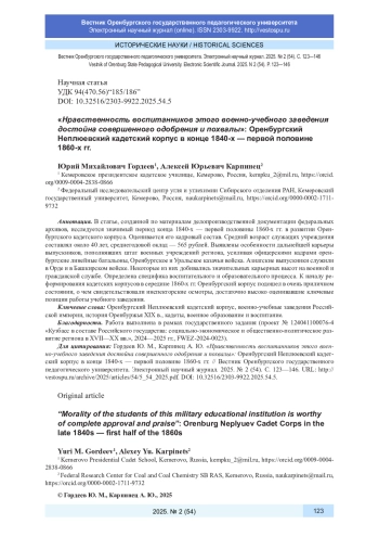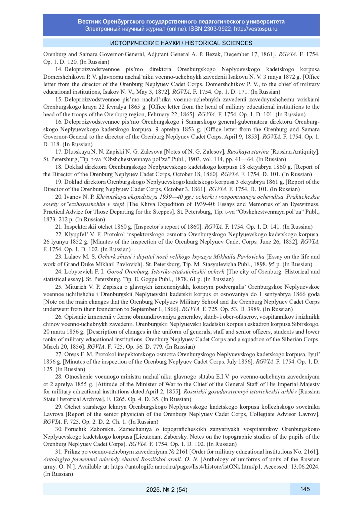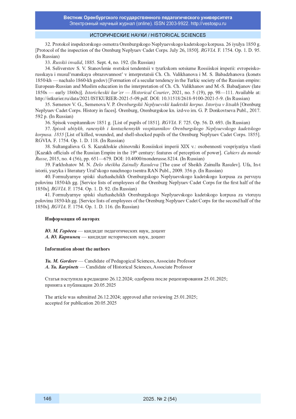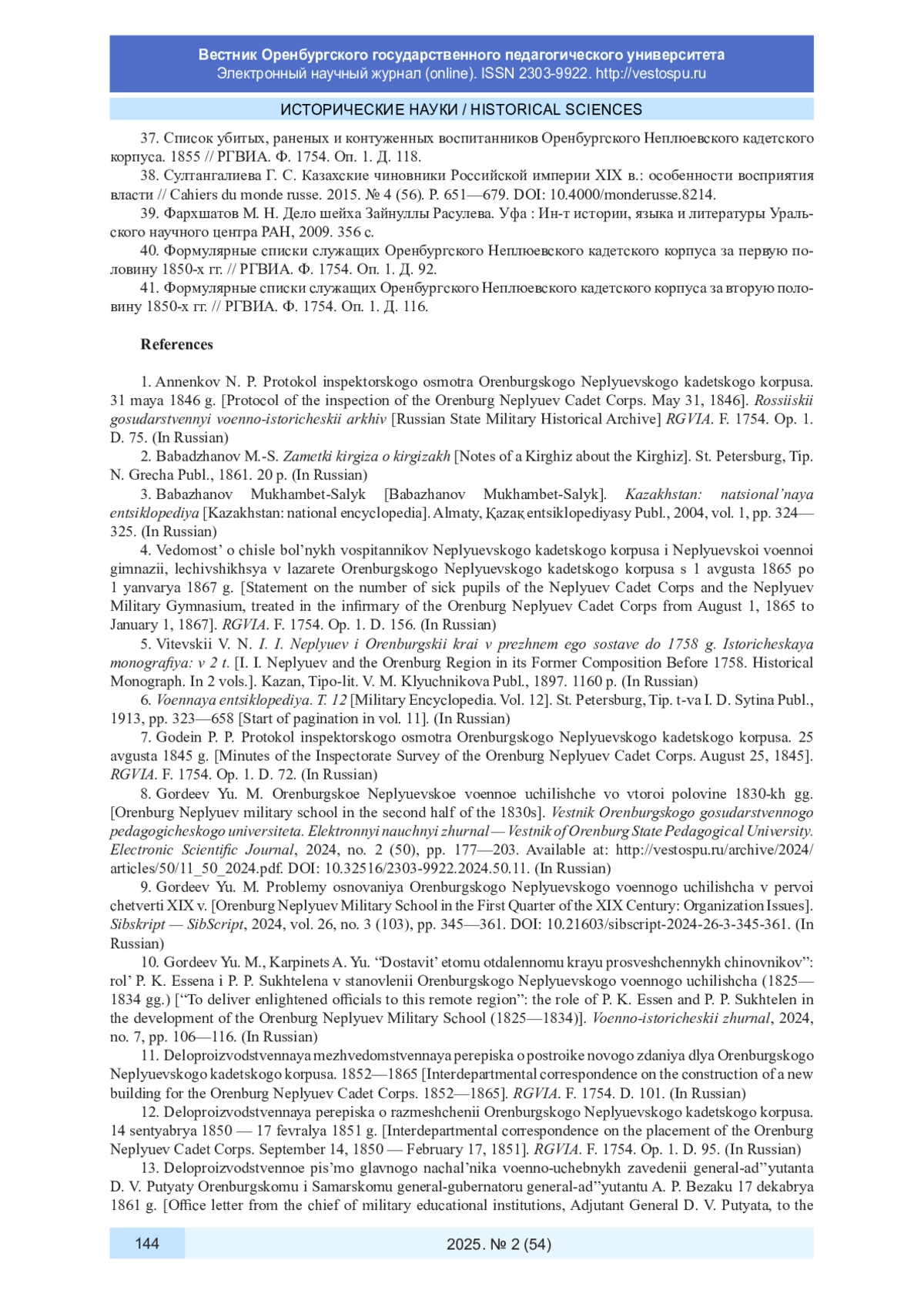 8. Гордеев Ю. М. Оренбургское Неплюевское военное училище во второй половине 1830-х гг. // Вестник Оренбургского государственного педагогического университета. Электронный научный журнал. 2024. № 2 (50). С. 177-203. URL: http://vestospu.ru/archive/2024/articles/50/11_50_2024.pdf. DOI: 10.32516/2303-9922.2024.50.11 EDN: HWOFOU