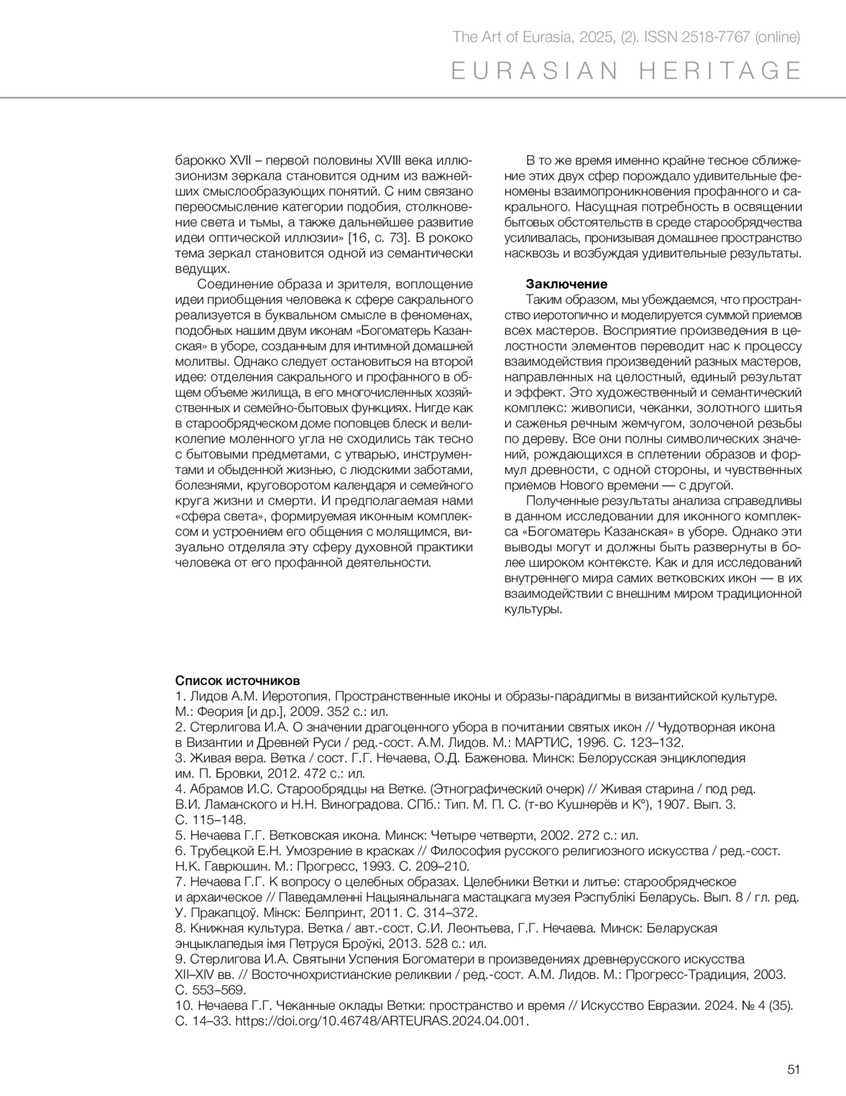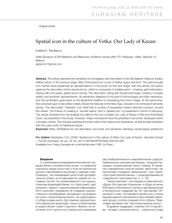 10. Nechaeva, G.G. (2024) ‘Embossed icon covers of Vietka: space and time’, in Iskusstvo Evrazii = The Art of Eurasia, (4), pp. 14–33. doi:10.46748/ARTEURAS.2024.04.001. (In Russ.)