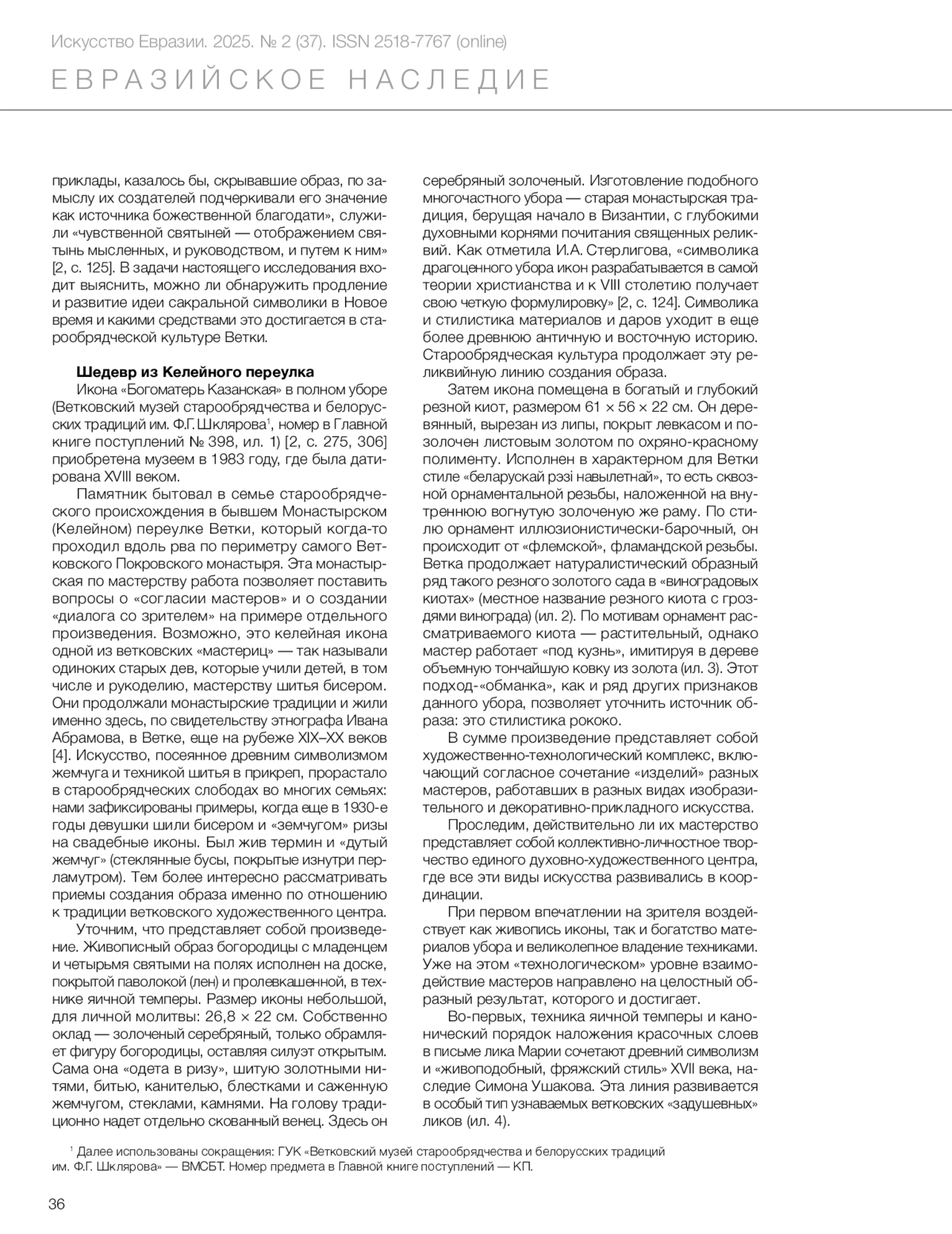 Нечаева Г.Г. Пространственная икона в культуре Ветки: Богоматерь Казанская // Искусство Евразии [Электронный журнал]. 2025. No 2 (37). С. 34–53. https://doi.org/10.46748/ARTEURAS.2025.02.003. URL: https://eurasia-art.ru/art/article/view/1180.