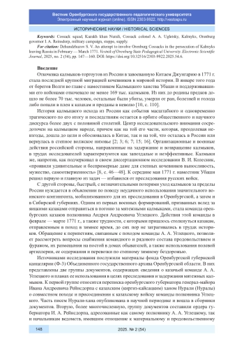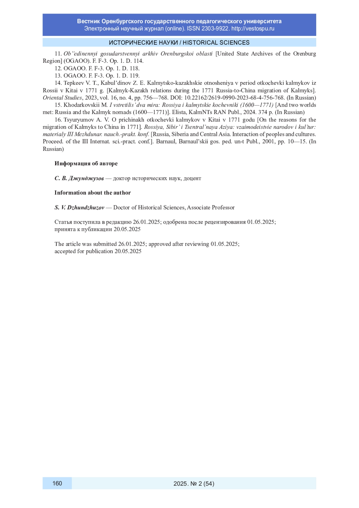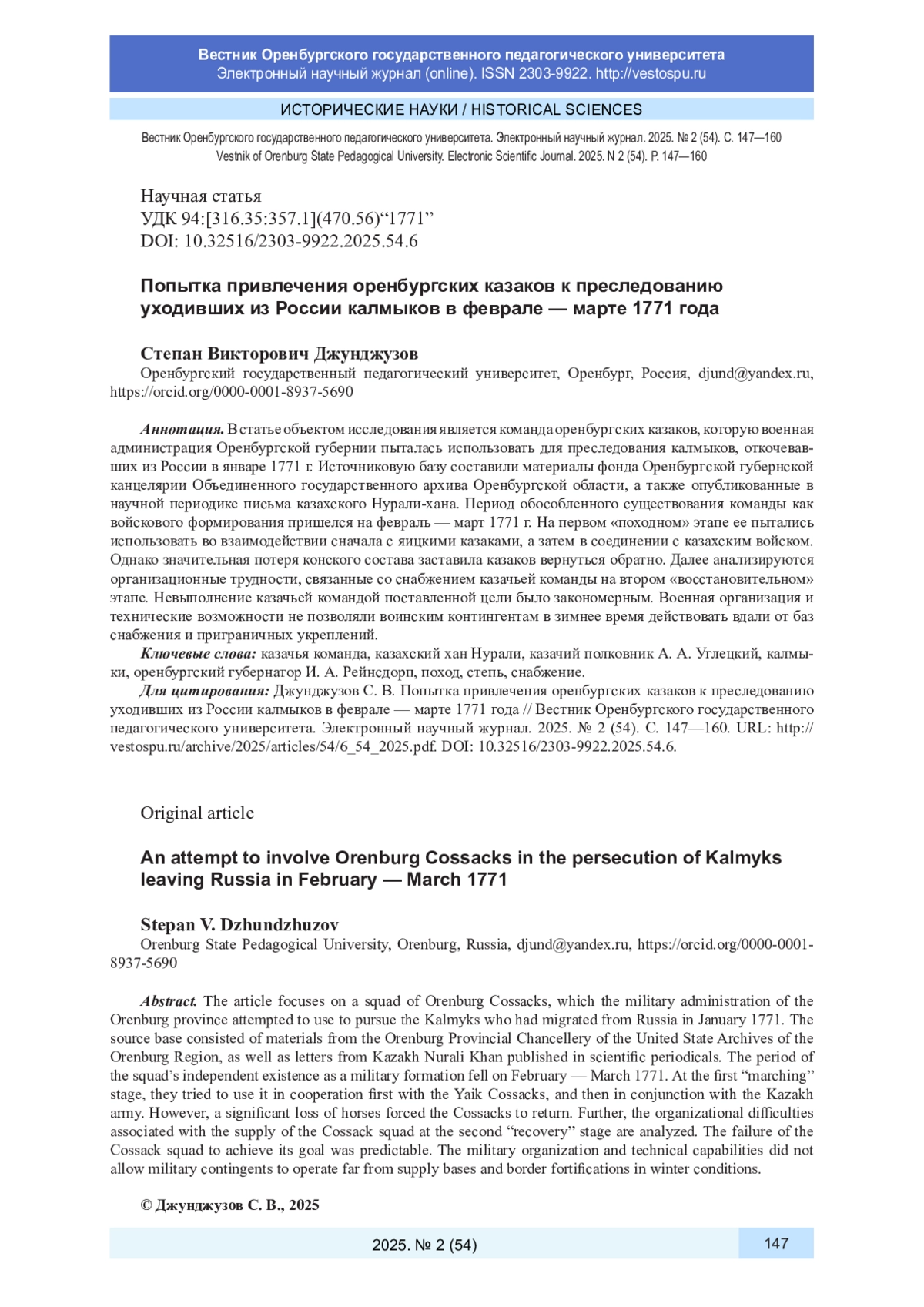 5. Джунджузов С. В. Привлечение яицких казаков к преследованию откочевывавших из России калмыков в январе - марте 1771 года // Вестник Оренбургского государственного педагогического университета. Электронный научный журнал. 2025. № 1 (53). С. 107-122. URL: http://vestospu.ru/archive/2025/articles/53/7_53_2025.pdf. DOI: 10.32516/2303-9922.2025.53.7 EDN: ABZGWL