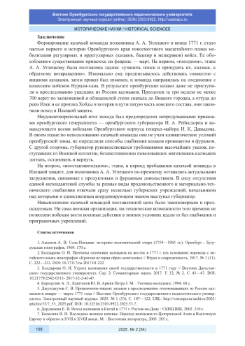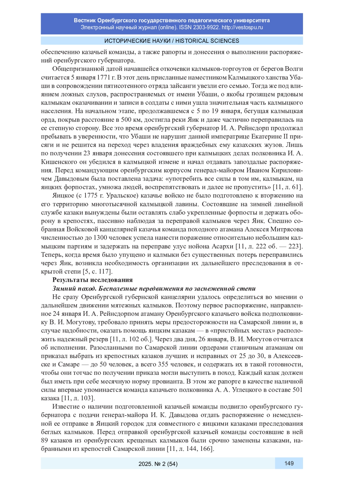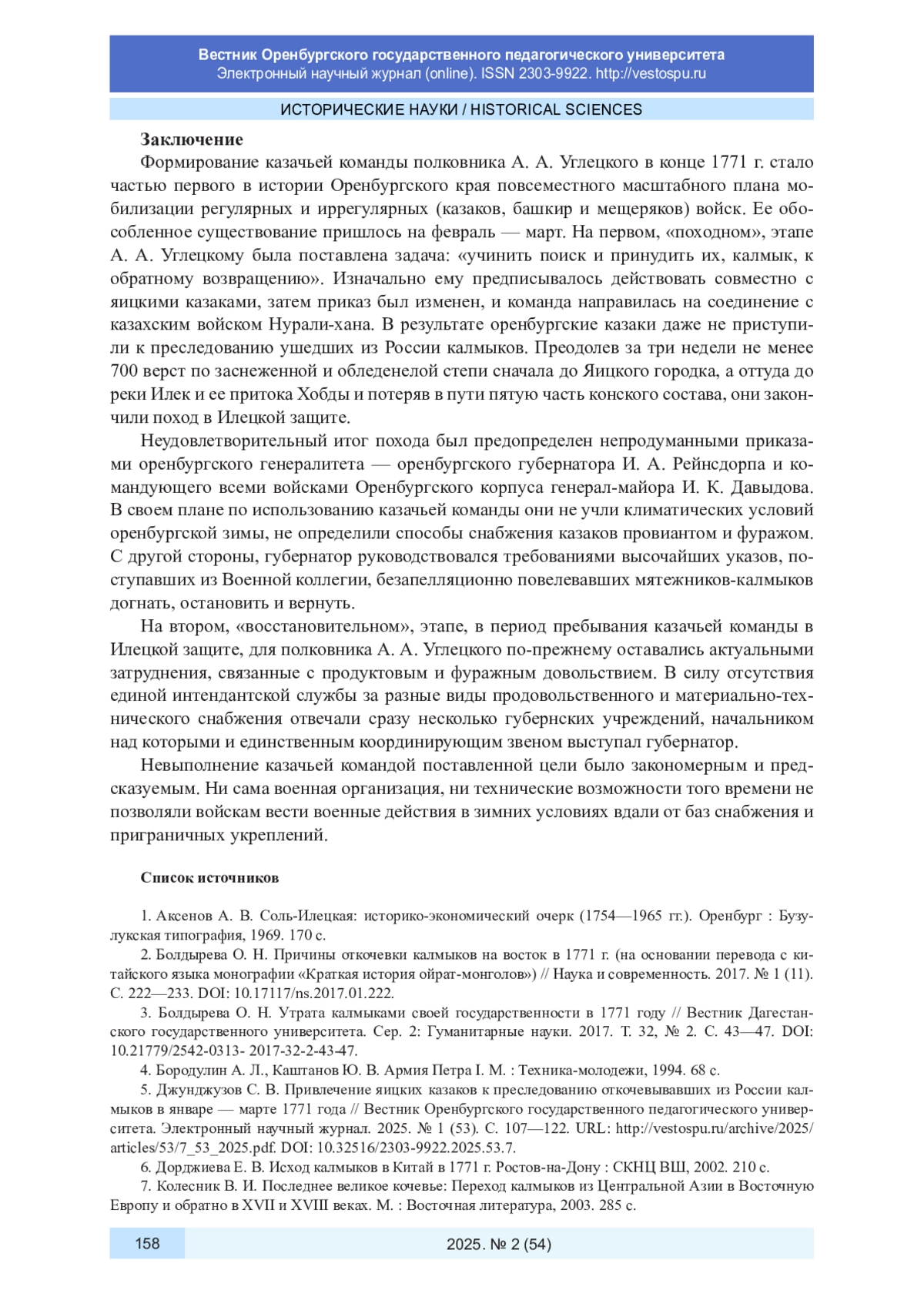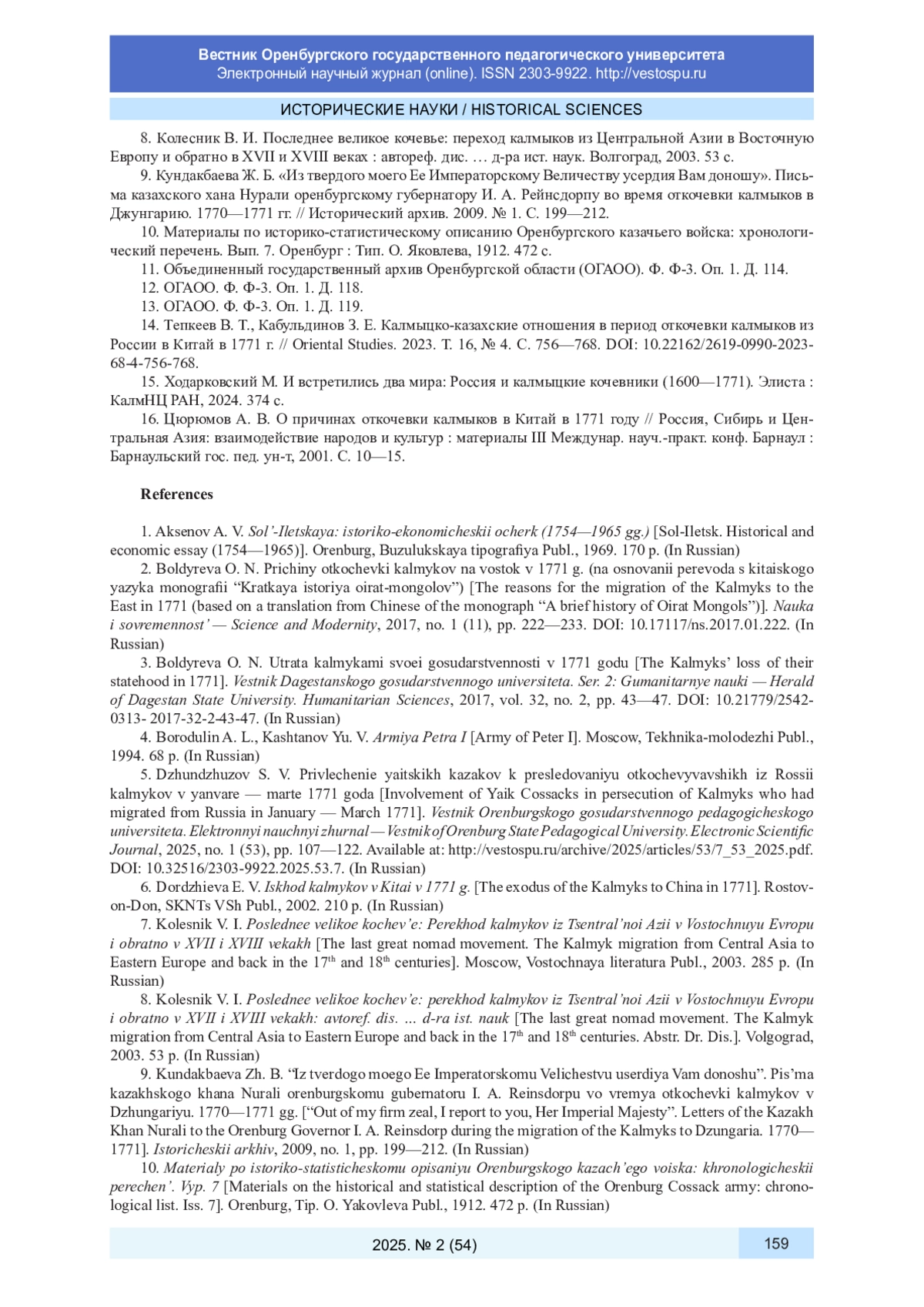 5. Джунджузов С. В. Привлечение яицких казаков к преследованию откочевывавших из России калмыков в январе - марте 1771 года // Вестник Оренбургского государственного педагогического университета. Электронный научный журнал. 2025. № 1 (53). С. 107-122. URL: http://vestospu.ru/archive/2025/articles/53/7_53_2025.pdf. DOI: 10.32516/2303-9922.2025.53.7 EDN: ABZGWL