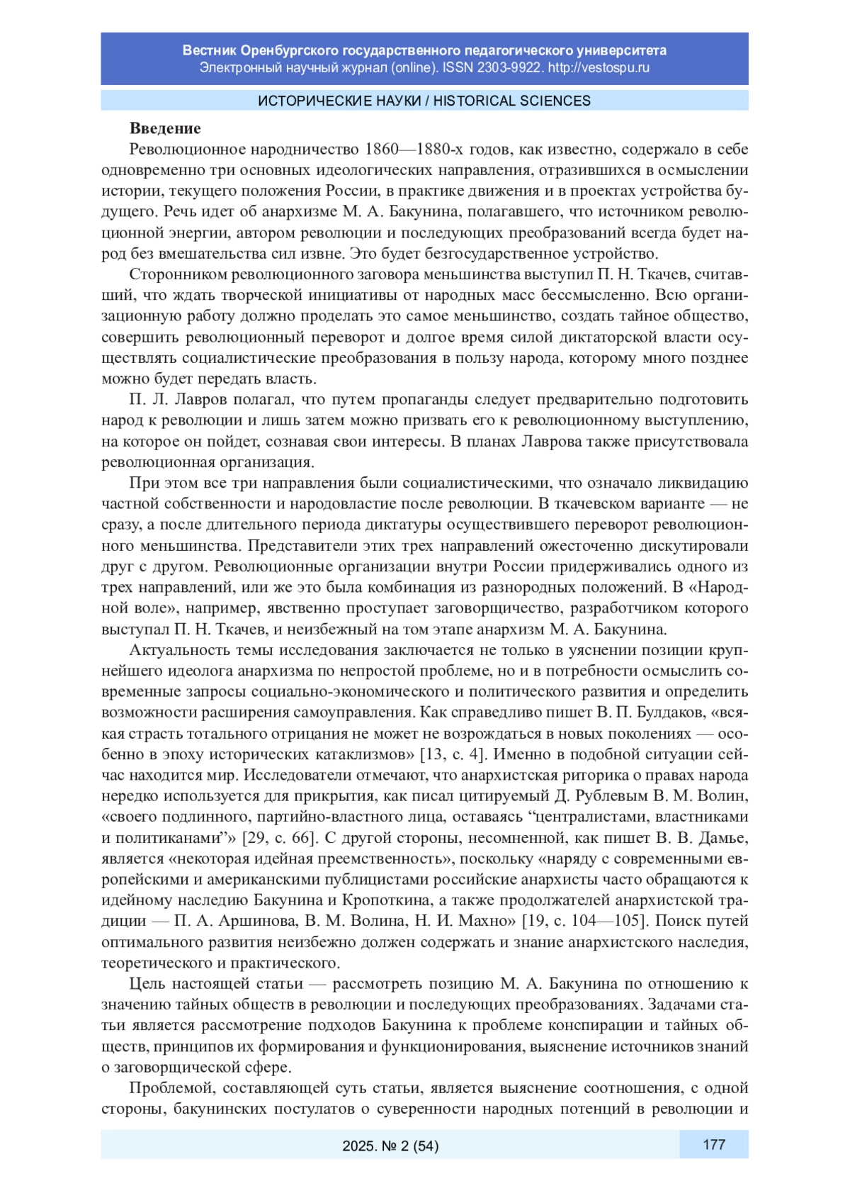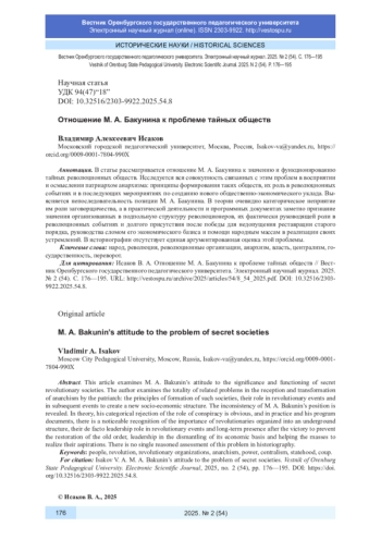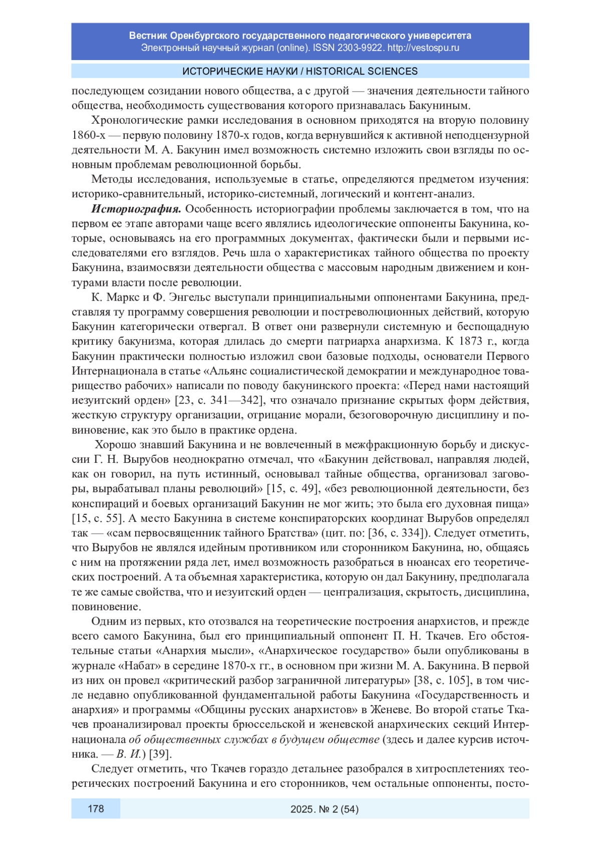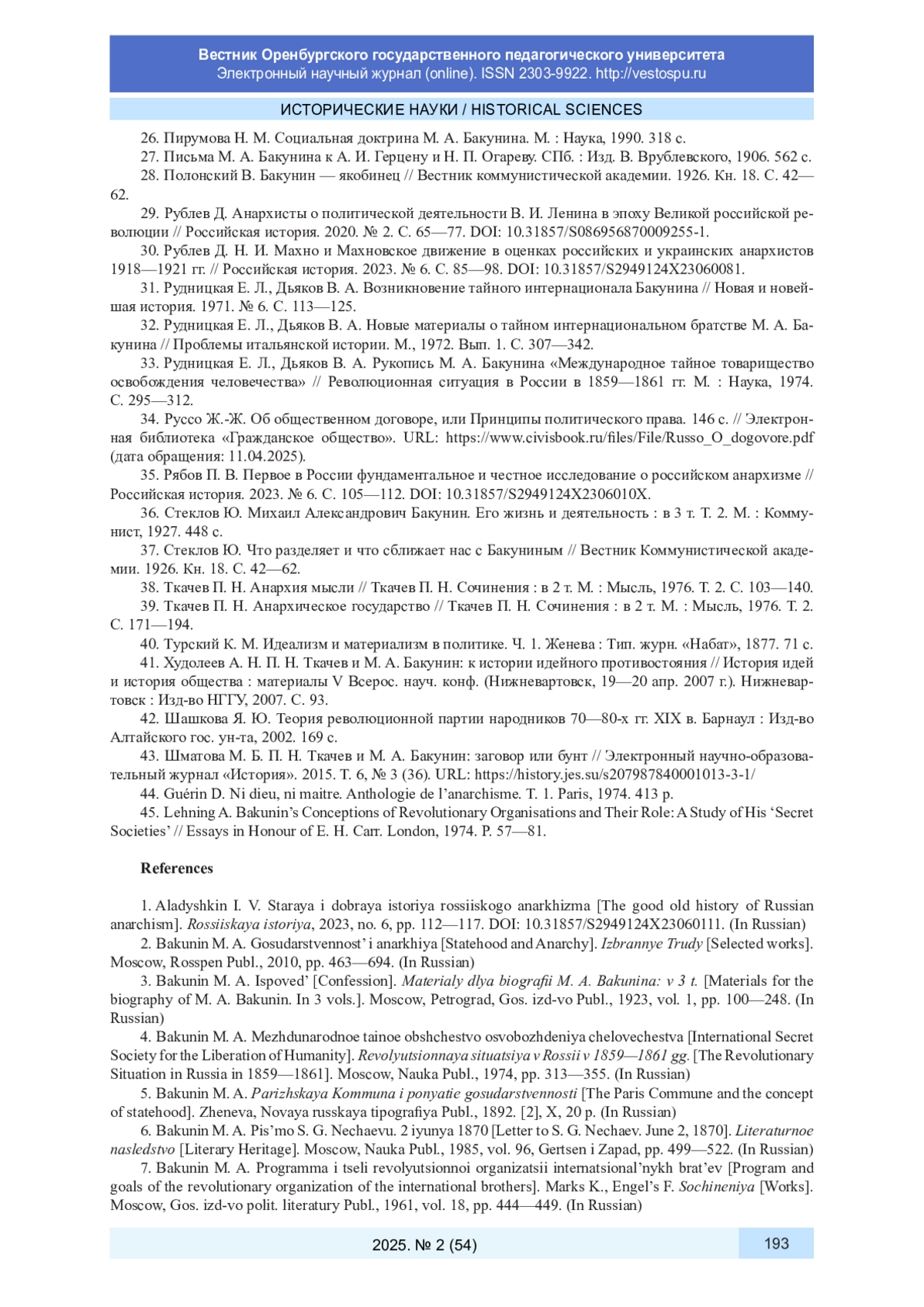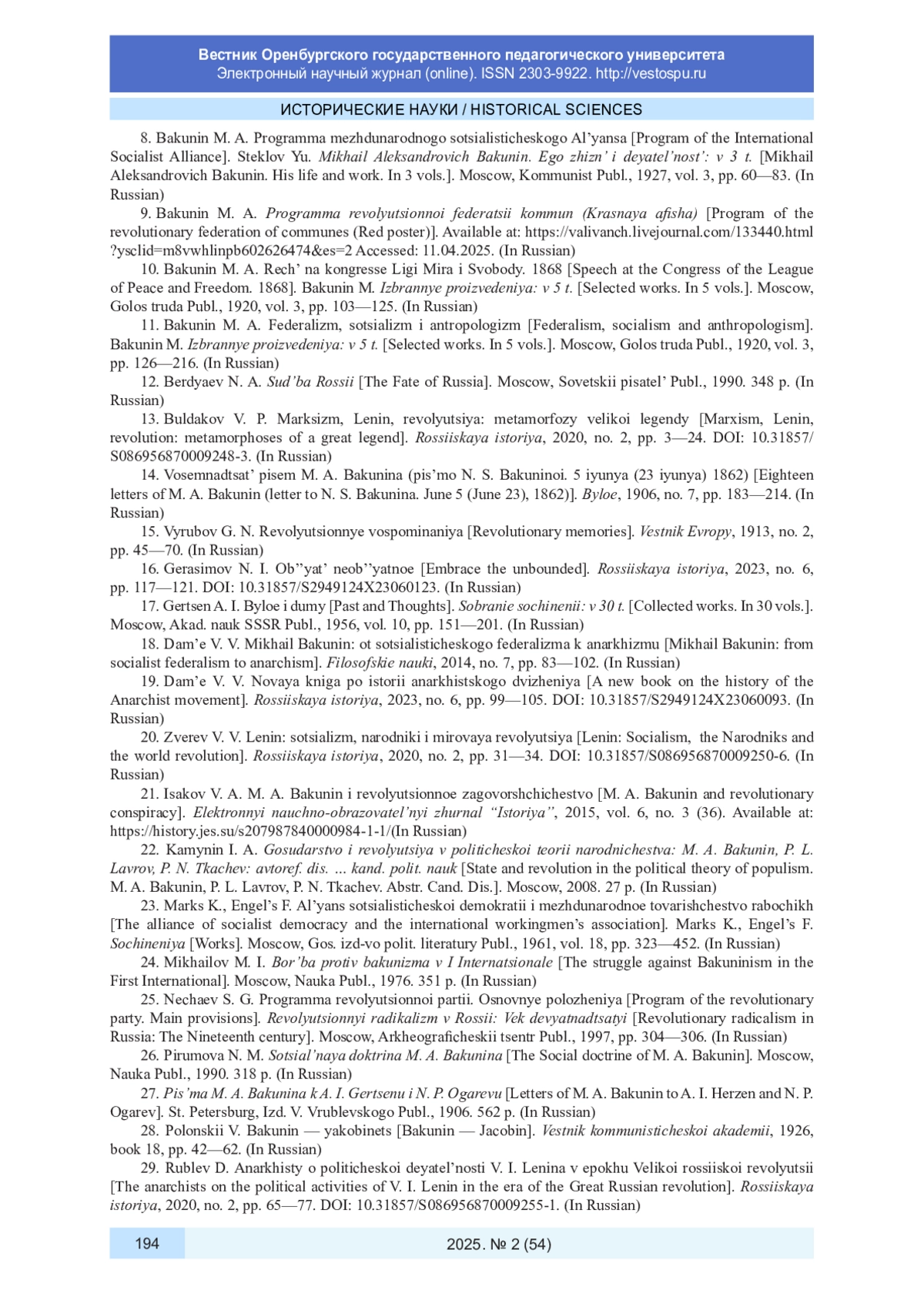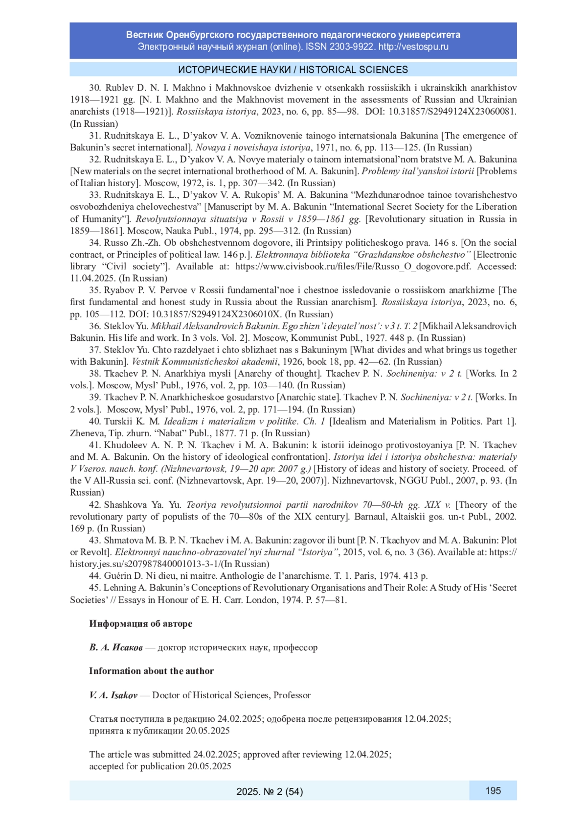 21. Исаков В. А. М. А. Бакунин и революционное заговорщичество // Электронный научно-образовательный журнал “История”. 2015. T. 6, № 3 (36). URL: https://history.jes.su/s207987840000984-1-1. EDN: UAAWAH