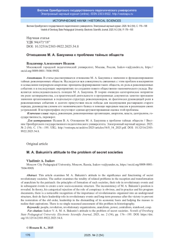 В статье рассматривается отношение М. А. Бакунина к значению и функционированию тайных революционных обществ. Исследуется вся совокупность связанных с этим проблем в восприятии и осмыслении патриархом анархизма: принципы формирования таких обществ, их роль в революционных событиях и в последующих мероприятиях по созданию нового общественно-экономического уклада. Выясняется непоследовательность позиции М. А. Бакунина. В теории очевидно категорическое неприятие им роли заговорщичества, а в практической деятельности и программных документах заметно признание значения организованных в подпольную структуру революционеров, их фактически руководящей роли в революционных событиях и долгого присутствия после победы для недопущения реставрации старого порядка, руководства сломом его экономического базиса и помощи народным массам в реализации своих устремлений. В историографии отсутствует единая аргументированная оценка этой проблемы.