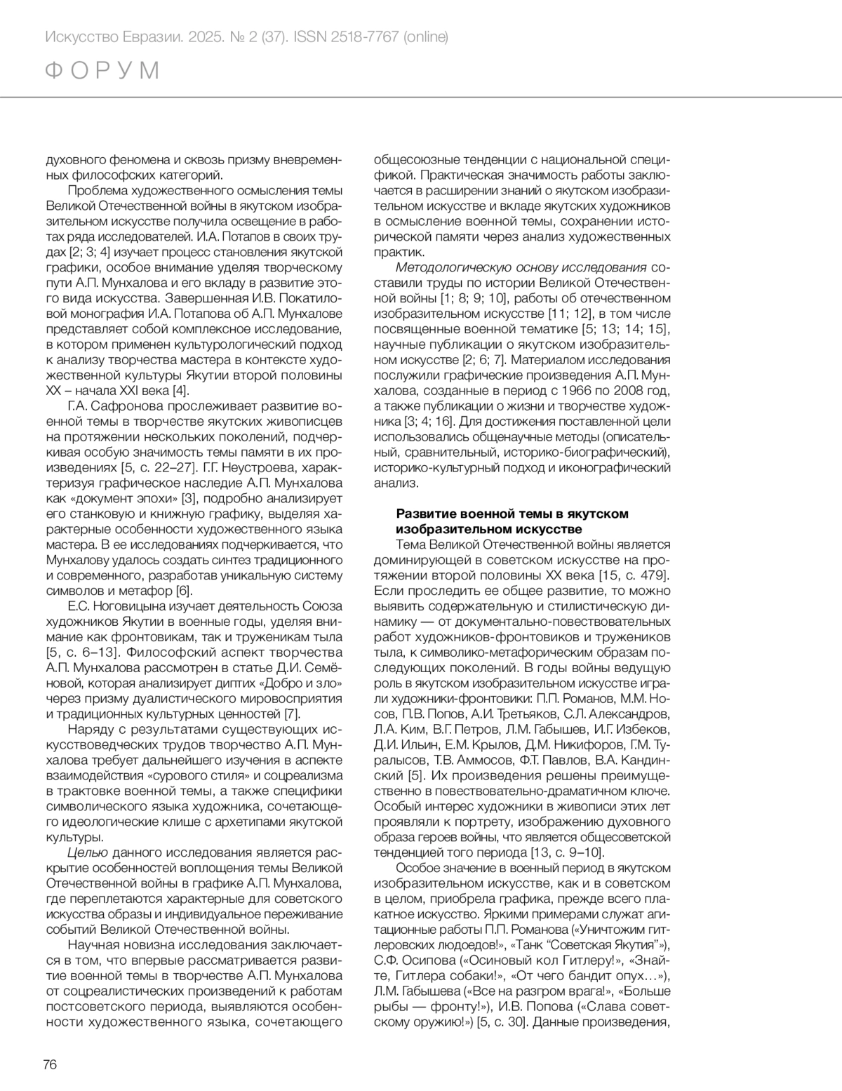 The article is devoted to the study of artistic representation of the Great Patriotic War theme in the works of the Yakut graphic artist Afanasy Munkhalov (1935-2014), who made a significant contribution to the development of the national fine arts. With the 90th anniversary of the master’s birth in 2025 and the 80th anniversary of the Victory in the Great Patriotic War, it is important to examine his creative legacy. The scientific significance of this work lies in the need to understand how the war theme has evolved in national art, given the distance between the events of the Great Patriotic War and today’s reality. The research is based on Munkhalov’s graphic works, as well as scientific and journalistic sources on his life and work. Building on previous studies, this work focuses on analysing the development of the war theme in his works, which is a new direction in the study of his heritage. Using a historical and cultural approach and the comparative method, as well as historical-biographical and iconographic analysis, the following results are obtained. The study provides an overview of the development of the war theme in Yakutian fine arts, summarizes the artist’s biography and creative formation, and examines the interaction between official Soviet aesthetics and Munkhalov’s individual understanding of the war theme. This is demonstrated through a number of works created by the artist between 1966 and 2008. The article also reveals the artist’s characteristic visual language, which combines Yakut national symbols with universal artistic imagery. Special attention is given to the graphic series “The Saga of the Churapcha Resettlement”, which represents a new stage in comprehending the tragic events of the Great Patriotic War in Yakut visual art. It is not a documentary chronicle, but rather the artist’s creative reflection on the war, filtered through his childhood world-view.
