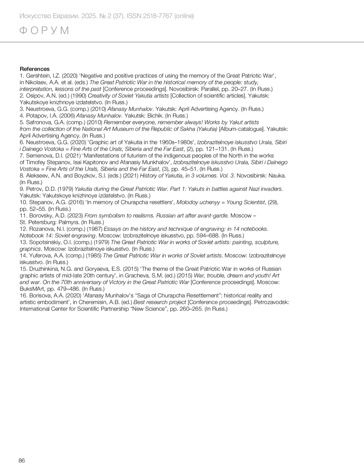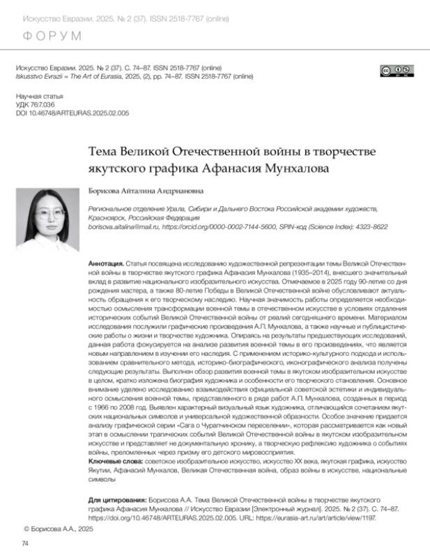 Борисова А.А. Тема Великой Отечественной войны в творчестве якутского графика Афанасия Мунхалова // Искусство Евразии [Электронный журнал]. 2025. No 2 (37). С. 74–87.