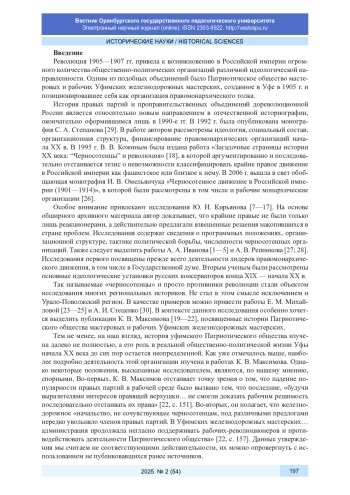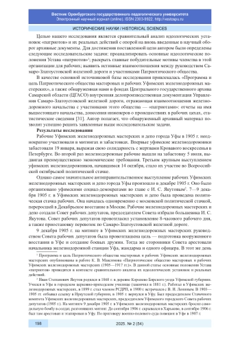 Статья посвящена деятельности одной из крупнейших правомонархических организаций в Уфимской губернии начала ХХ в. - Патриотического общества мастеровых и рабочих Уфимских железнодорожных мастерских. В исследовании анализируются основные идеологические положения устава «патриотов», дается их политическая оценка. Раскрываются главные побуждающие мотивы членства рабочих в этой организации. Описываются взаимоотношения между руководством Самаро-Златоустовской железной дороги и участниками Патриотического общества. Реконструируются исторические события, происходившие в Уфимских железнодорожных мастерских в период революции 1905-1907 гг.