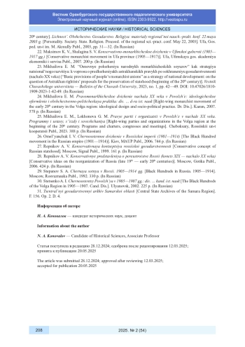 23. Михайлова Е. М. “Основные положения народных монархических союзов” как стратегия национального развития: к вопросу о предложениях астраханских правых по сохранению государственности (начало XX века) // Вестник Чувашского университета. 2023. № 1. С. 42-49. DOI: 10.47026/1810-1909-2023-1-42-49 EDN: DQVSNN