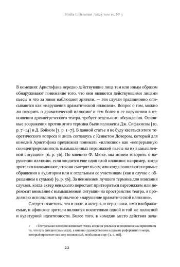 В комедиях Аристофана нередко действующие лица тем или иным образом обнаруживают понимание того, что они являются действующими лицами пьесы и что за ними наблюдают зрители, — эти случаи традиционно описываются как «нарушения драматической иллюзии». Вопрос о том, можно ли говорить о драматической иллюзии1 и тем более о ее нарушении в отношении древнегреческого театра, требует отдельного обсуждения. Основные возражения против этого термина были изложены Дж. Сифакисом [10, p. 7–14] и Д. Бэйном [3, p. 1–7]. В данной статье я не буду касаться этого теоретического вопроса и лишь соглашусь с Кеннетом Довером, который для комедий Аристофана предложил понимать «иллюзию» как «непрерывную сконцентрированность вымышленных персонажей пьесы на их вымышленной ситуации» [6, p. 56]. По мнению Ф. Мюке, мы можем говорить о нарушении иллюзии, если вводится еще один слой иллюзии: например, когда зрителям напоминают, что они смотрят пьесу, или когда появляются прямые обращения к аудитории или к отдельным ее участникам (как в случае с обращением к судьям) [9, p. 56]. За неимением лучшего термина для описания случаев, когда актер ненадолго перестает притворяться персонажем или переносит внимание с вымышленной ситуации на пространство театра, я продолжаю использовать привычное «нарушение драматической иллюзии».