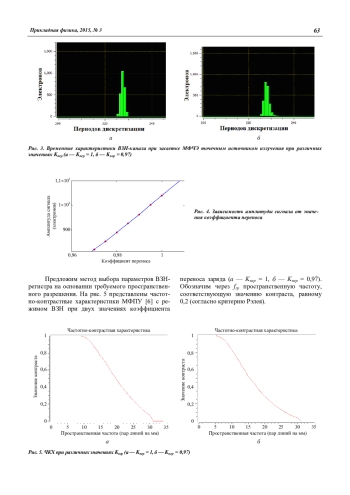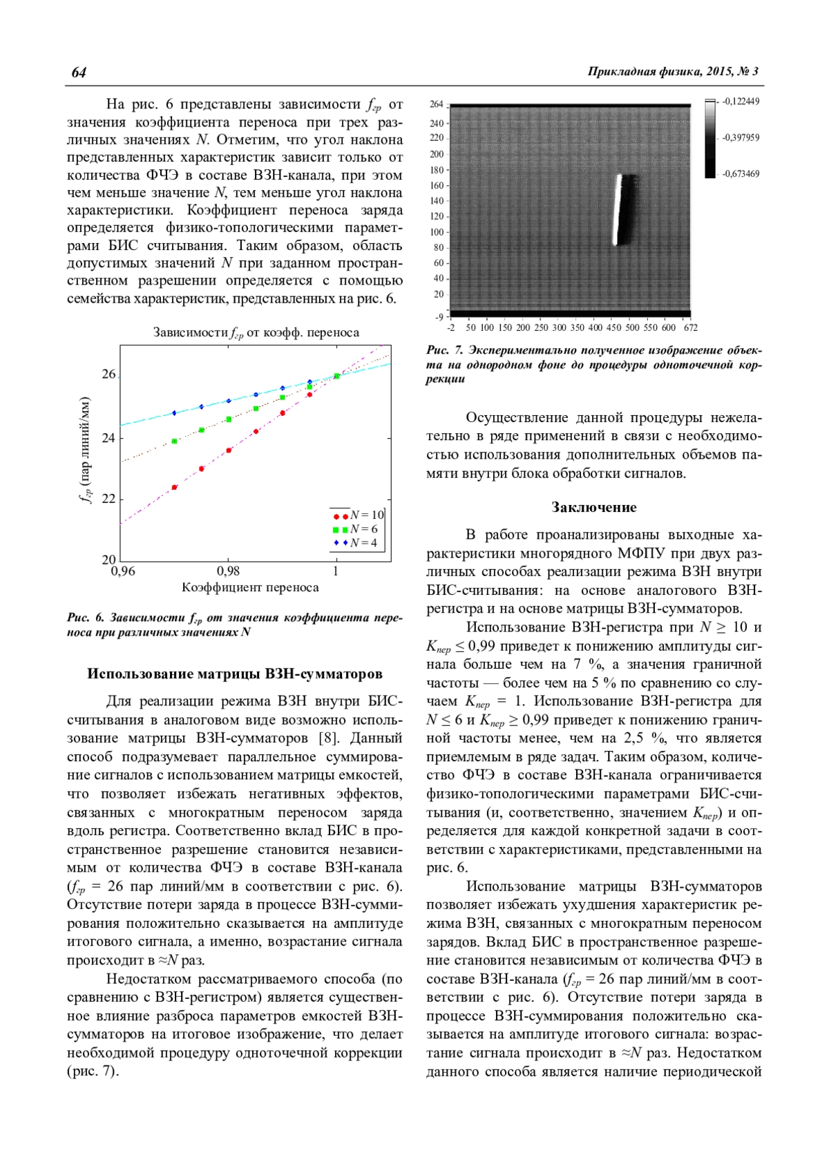 Использование матрицы ВЗН-сумматоров позволяет избежать ухудшения характеристик режима ВЗН, связанных с многократным переносом зарядов. Вклад БИС в пространственное разрешение становится независимым от количества ФЧЭ в составе ВЗН-канала (fгр = 26 пар линий/мм в соответствии с рис. 6). Отсутствие потери заряда в процессе ВЗН-суммирования положительно сказывается на амплитуде итогового сигнала: возрастание сигнала происходит в ≈N раз. Недостатком данного способа является наличие периодической амплитудной модуляции выходного сигнала, устраняемой с помощью процедуры одноточечной коррекции. В ряде применений осуществление процедуры одноточечной коррекции нежелательно, т. к. приводит к необходимости наличия дополнительных объемов памяти в составе блока обработки сигналов.