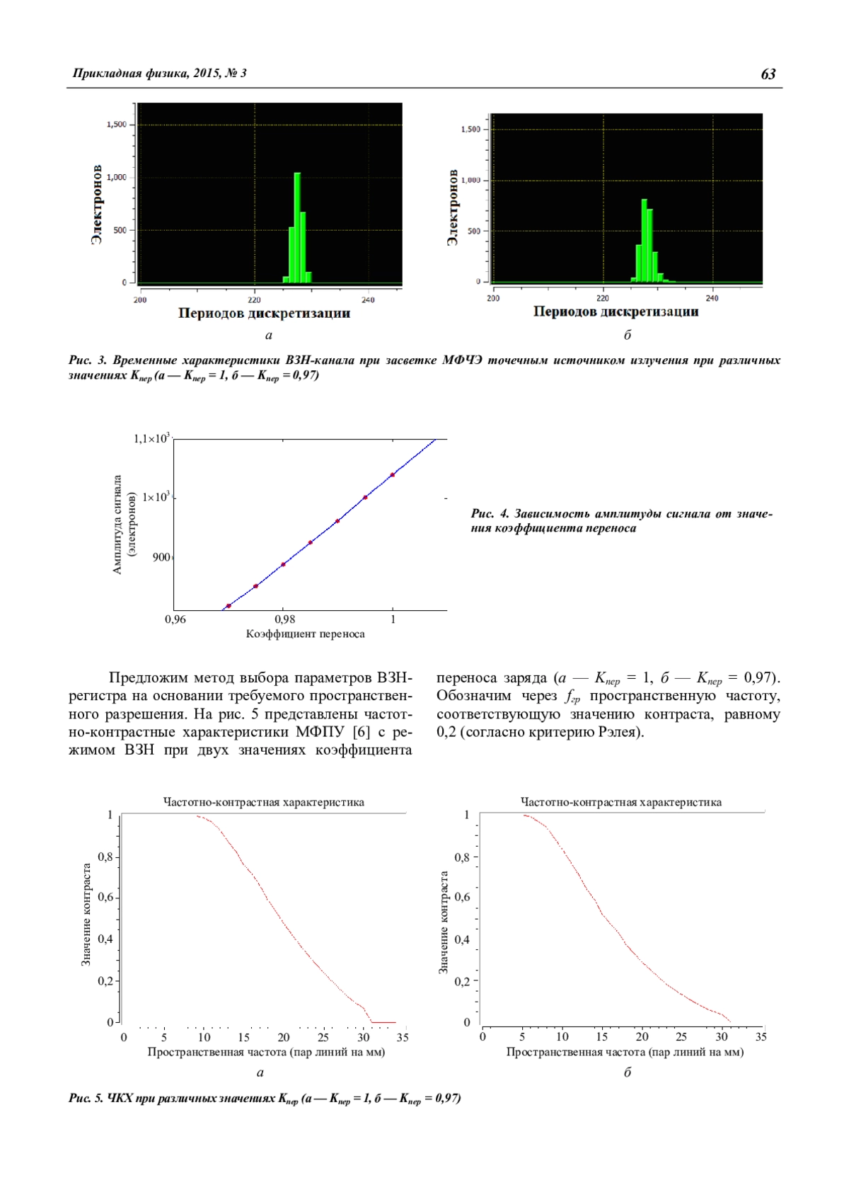 Использование ВЗН-регистра при N ≥ 10 и Kпер ≤ 0,99 приведет к понижению амплитуды сигнала больше чем на 7 %, а значения граничной частоты — более чем на 5 % по сравнению со случаем Kпер = 1. Использование ВЗН-регистра для N ≤ 6 и Kпер ≥ 0,99 приведет к понижению граничной частоты менее, чем на 2,5 %, что является приемлемым в ряде задач. Таким образом, количество ФЧЭ в составе ВЗН-канала ограничивается физико-топологическими параметрами БИС-считывания (и, соответственно, значением Kпер) и определяется для каждой конкретной задачи в соответствии с характеристиками, представленными на рис. 6.