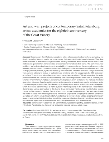 Современные петербургские академические художники постоянно обращаются к теме войны и Победы, решая ее не столько через пересказ исторических событий, сколько через выражение личного отношения к прошлому, взывая к памяти своих отцов и дедов, вспоминая их рассказы о войне, слезы своих матерей и бабушек. Эмоциональное начало преобладает над нарративностью. В произведениях на военную тему ощутимы боль утрат, боязнь забвения, волнение о событиях сегодняшнего дня, обнаруживается связь времен. Противопоставлением тяжелым переживаниям о войне выступают размышления о человеческом мужестве, патриотизме, героизме, верности, о красоте родной земли. В своих произведениях художники демонстрируют весь диапазон чувств - от боли и страдания до чувства очищения и эмоционального облегчения. В год 80-летнего юбилея Великой Победы осмысление военной истории в образах искусства стало вновь актуальным. В статье рассмотрены произведения современных петербургских художников-академистов А. Новосёлова, Ф. Иванова, Р. Яхиханова, В. Каджаева, И. Журавлёва, Ч. Гугкаева, И. Зорькина и других авторов, преимущественно созданные в XXI веке. Для их исследования использованы методы включенного наблюдения, интервью, образно-стилистического и сравнительного искусствоведческого анализа. Рассмотрен один из крупнейших проектов Санкт-Петербургской академии художеств - выставка в Республике Коми, разнопланово представившая произведения петербургских художников о войне. Экспозиция продемонстрировала различные подходы к решению этой темы. Сделан вывод о необходимости развития темы памяти о Великой Отечественной войне, осмысления глобальных проблем войны и мира в произведениях художников разных поколений. Современные художественные проекты, объединяющие разные виды искусства и многих мастеров, не просто способны донести до зрителя фундаментальные гуманистические идеи, но и ответить на злободневные вопросы сегодняшнего дня, помогают провести важные исторические параллели, соотнести мужество и героизм людей разных поколений, определить важность общечеловеческих ценностей, объединить представителей разных культур.