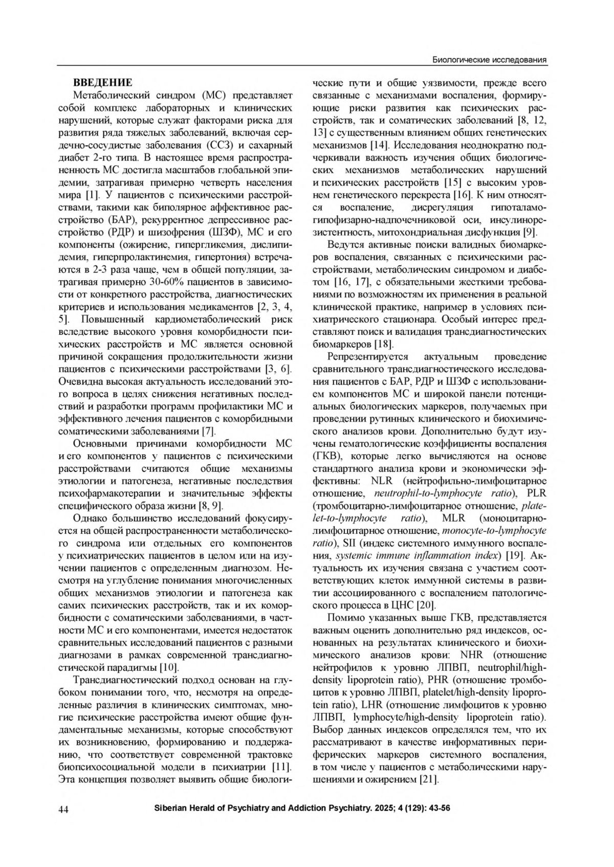 19. Горбунова А.П., Рукавишников Г.В., Касьянов Е.Д., Мазо Г.Э. Роль гематологических коэффициентов системного воспаления в диагностике и оценке риска аффективных расстройств. Обозрение психиатрии и медицинской психологии имени В.М. Бехтерева. 2024. Т. 58, № 1. С. 47-55.