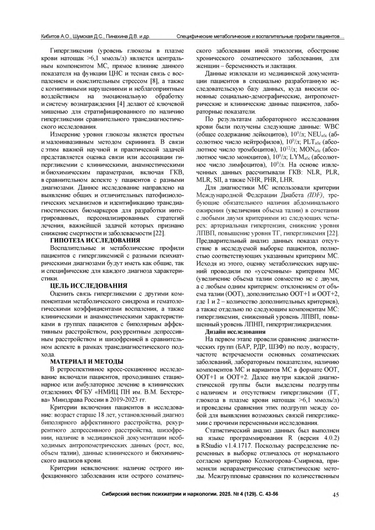 32. Корнетова Е.Г., Галкин С.А., Корнетов А.Н., Счастный Е.Д., Петкун Д.А., Меднова И.А., Бохан Н.А. Сравнительное исследование метаболических нарушений у стационарных пациентов с шизофренией и аффективными расстройствами. Социальная и клиническая психиатрия. 2024. Т. 34, № 2. С. 5-12.