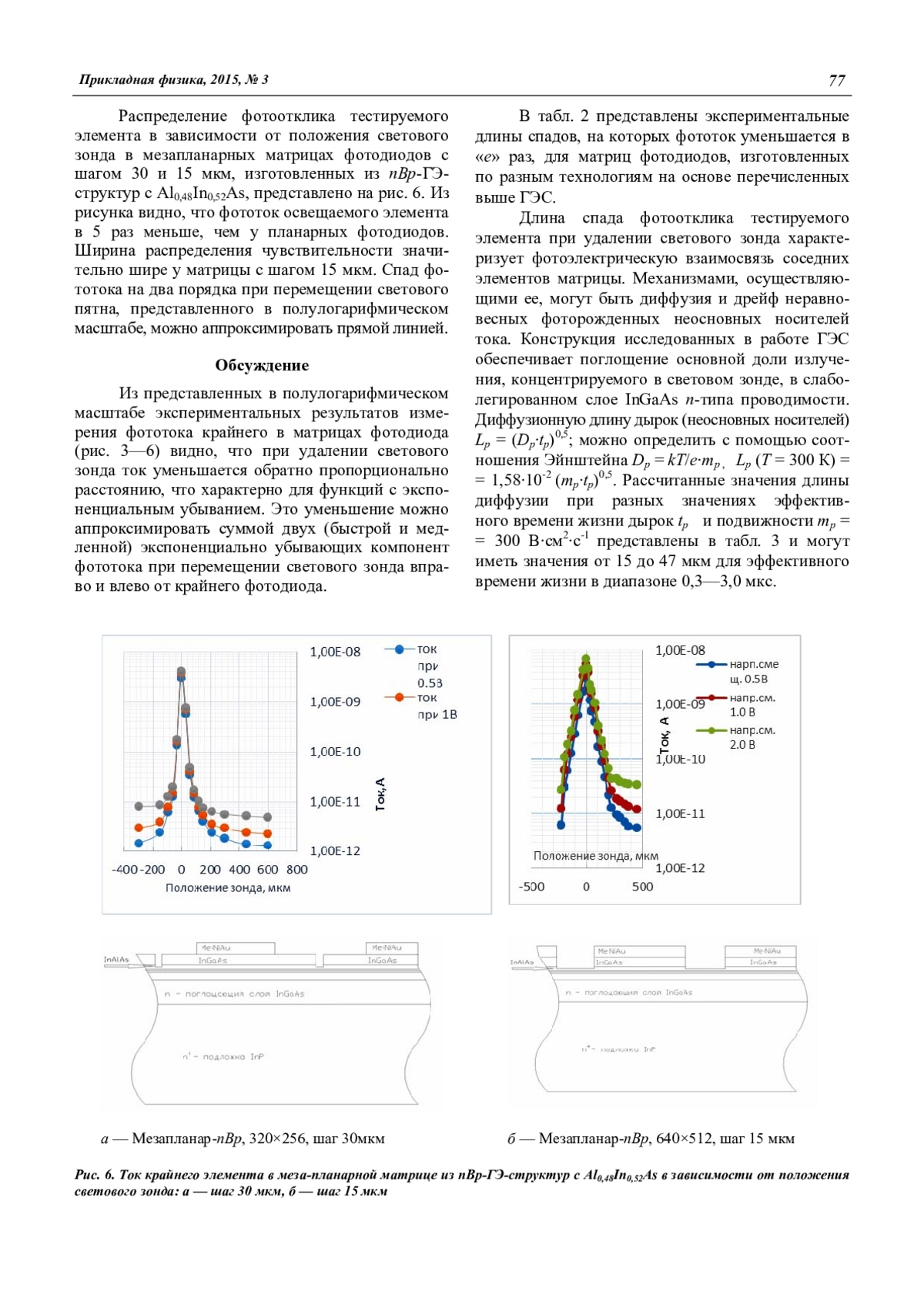 Представлены результаты исследований фотоэлектрической взаимосвязи элементов в матрицах ФЧЭ на основе различных гетероэпитаксиальных структур с поглощающим слоем InGaAs. Матрицы ФЧЭ изготовлены по разным технологиям: а — планарная, б — мезатехнология, в — мезапланарная на nB(Al0,48In0,52As)p-структурах. Показано, что в матрицах, изготовленных по мезапланарной технологии на nB(Al0,48In0,52As)p-структурах успешно сочетаются малые темновой ток и фотоэлектрическая взаимосвязь.