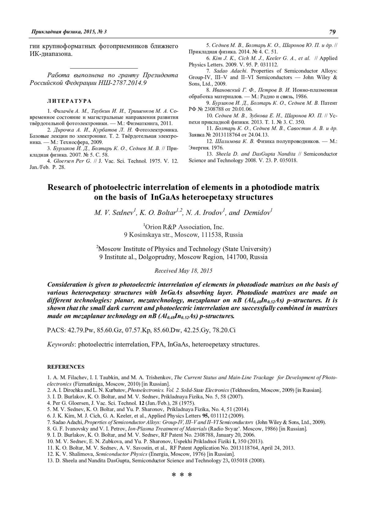 3. Бурлаков И. Д., Болтарь К. О., Седнев М. В. // Прикладная физика. 2007. № 5. С. 58.