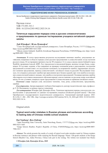 В статье представлены результаты исследования типичных ошибок, допускаемых китайскими учащимися в области порядка слов в русских предложениях и словосочетаниях в ходе изучения русского языка. В тестировании приняли участие 90 учащихся 12-го класса школы имени Кайцюй (город Хуайбэй, провинция Аньхой, КНР). Тест предлагался в письменной форме, включал четыре блока, содержащих 24 тестовых задания, и был направлен на проверку понимания ремы в предложении, построения предложений в соответствии с их актуальным членением, на исправление ошибок, нарушающих актуальное членение предложения, перевод словосочетаний с китайского языка на русский. Исследование показало, что учащиеся допускают ошибки при выполнении всех блоков заданий, при этом ошибок в построении словосочетаний намного меньше, чем ошибок в построении предложений. Основная причина ошибок обусловлена отсутствием специального обучения порядку слов на занятиях по русскому языку в китайской школе. В этих условиях учащиеся строят предложения и словосочетания по правилам китайского языка.