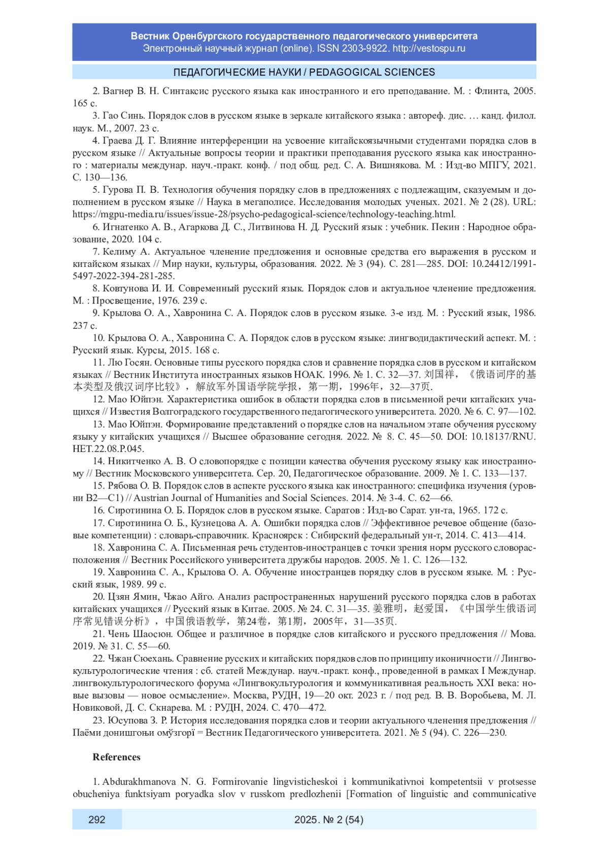 1. Абдурахманова Н. Г. Формирование лингвистической и коммуникативной компетенций в процессе обучения функциям порядка слов в русском предложении // Современное педагогическое образование. 2019. № 5. С. 137-140. EDN: OBRIRS
