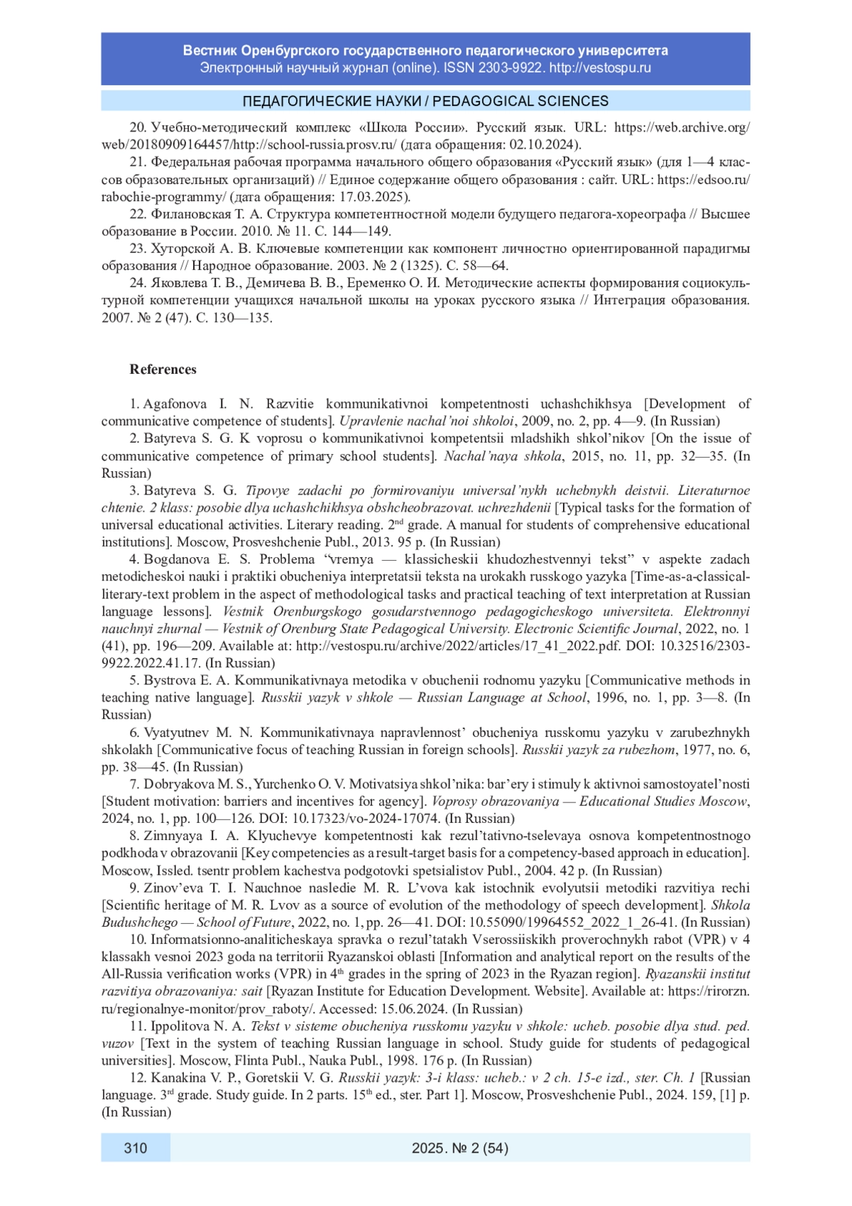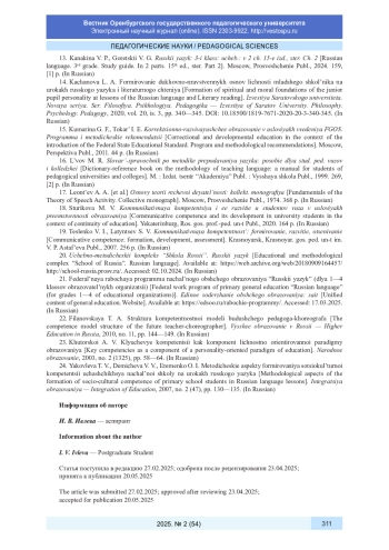 4. Богданова Е. С. Проблема “время - классический художественный текст” в аспекте задач методической науки и практики обучения интерпретации текста на уроках русского языка // Вестник Оренбургского государственного педагогического университета. Электронный научный журнал. 2022. № 1 (41). С. 196-209. URL: http://vestospu.ru/archive/2022/articles/17_41_2022.pdf. DOI: 10.32516/2303-9922.2022.41.17 EDN: RIKQNL