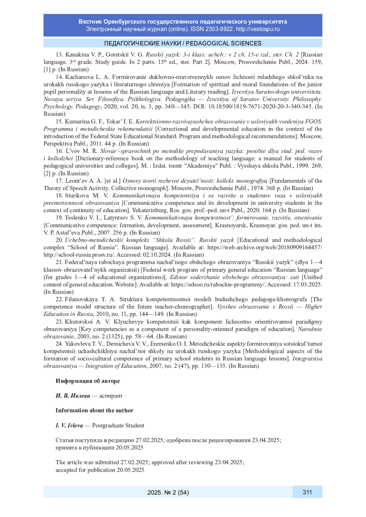 24. Яковлева Т. В., Демичева В. В., Еременко О. И. Методические аспекты формирования социокультурной компетенции учащихся начальной школы на уроках русского языка // Интеграция образования. 2007. № 2 (47). С. 130-135. EDN: JVDICL