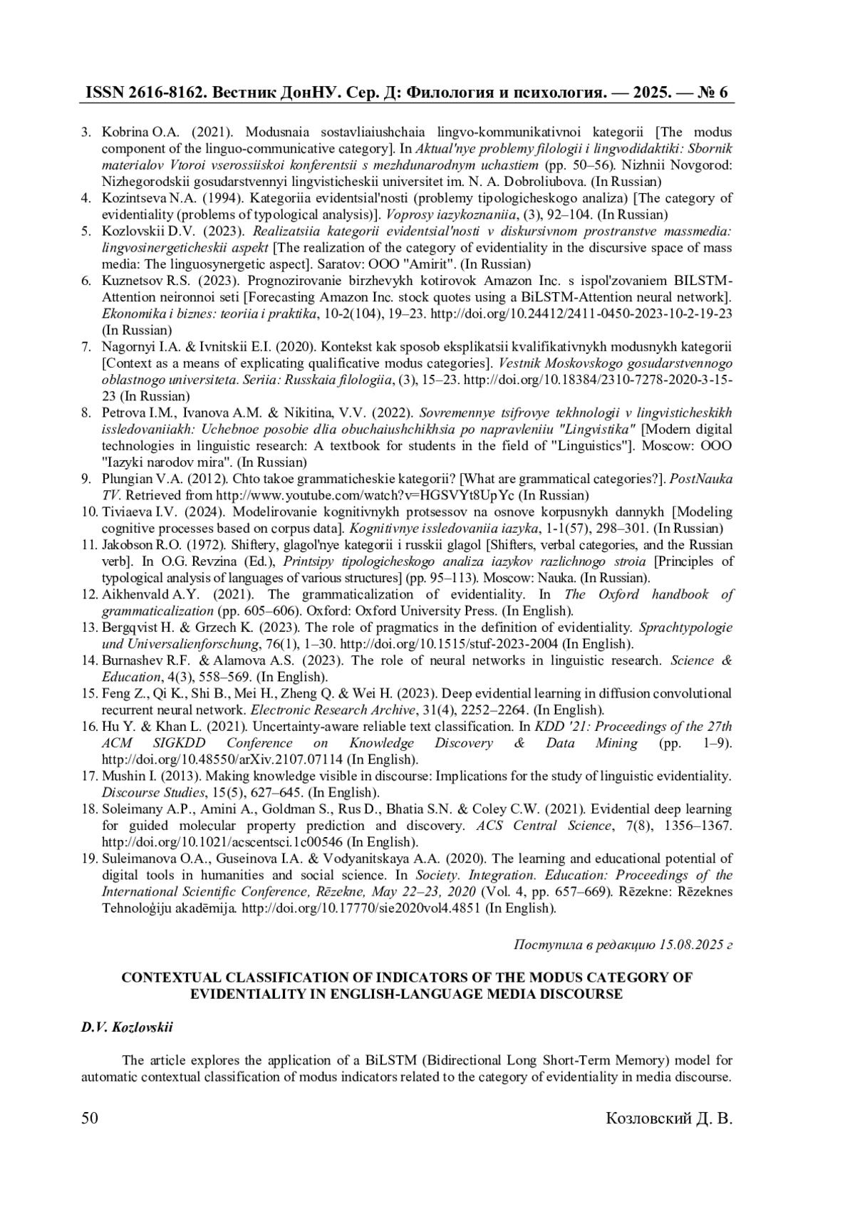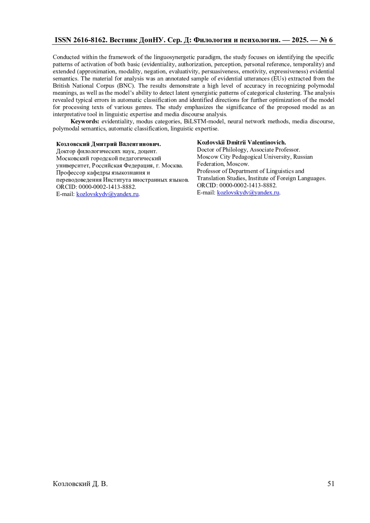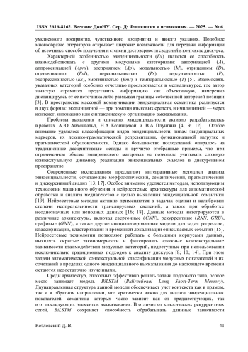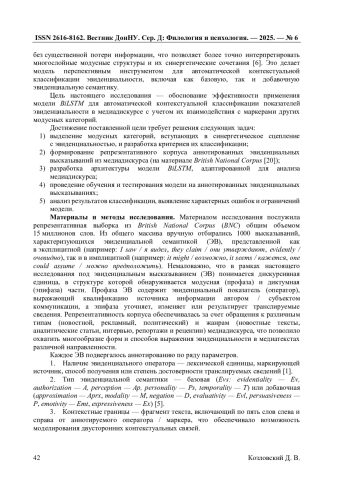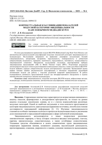 В статье рассматривается применение модели BiLSTM (Bidirectional Long Short-Term Memory) для автоматической контекстуальной классификации модусных показателей категории эвиденциальности в медиадискурсе. Исследование направлено на выявление специфики актуализации базовой (эвиденциальность, авторизация, восприятие, персональность, темпоральность) и добавочной (аппроксимация, модальность, отрицание, оценочность, персуазивность, эмотивность, экспрессивность) эвиденциальной семантики. Материалом исследования послужила аннотированная выборка эвиденциальных высказываний (ЭВ) из British National Corpus (BNC). Полученные результаты демонстрируют высокую точность распознавания полимодальных смыслов, а также способность BiLSTM- модели выявлять скрытые синергетические модели категориального сцепления. Проведенный анализ выявил типовые ошибки автоматической классификации и обозначил направления дальнейшей оптимизации модели для работы с текстами различной жанровой принадлежности. В работе подчеркивается значимость представленной модели как интерпретационного инструмента в задачах лингвистической экспертизы и анализа медиадискурса.