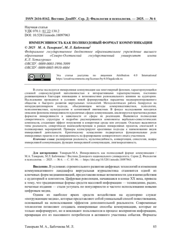 В статье исследуется иммерсивная коммуникация как многомерный феномен, характеризующийся сложной социокультурной наполненностью и интерактивными характеристиками, постоянно развивающимися благодаря инновациям и возможностями разноканального влияния на аудиторию. Исследование проводится в условиях новой формирующейся парадигмы медиаориентированного общества и быстрого развития виртуальных технологий. Методологически работа базируется на интердисциплинарном подходе, объединяющем методы коммуникативистики, психологии, психолингвистики, культурологии и когнитивной лингвистики. В фокусе исследования находится описание феномена иммерсивности в различных сферах коммуникации, анализируется прагматика разных форматов иммерсивности в зависимости от сферы их реализации. Выявляется поликодовая синкретичность структуры и подробно рассматриваются компоненты вербально-синестетических комплексов, создающие эффект погружения в конкретные среды или ситуации. Отдельно выделяются типы реальности, синергически взаимодействующие в рамках иммерсивных проектов, спектаклей и полижанровых мероприятий. Примеры иллюстрируют креативные подходы к наименованию видов иммерсивной деятельности. Критическому осмыслению подвергаются функциональные роли иммерсивных практик и их направленность на формирование конвергентного опыта участников.