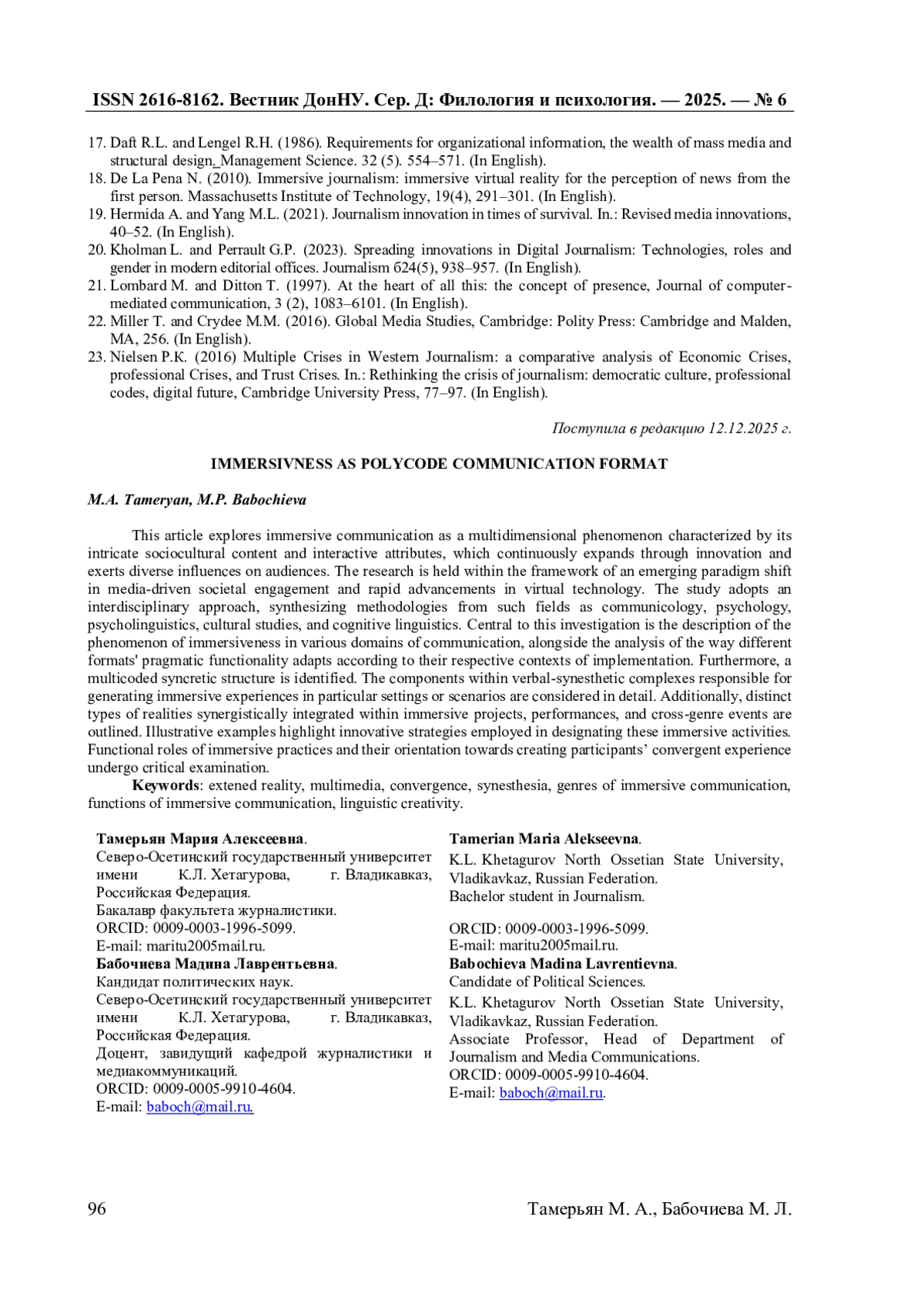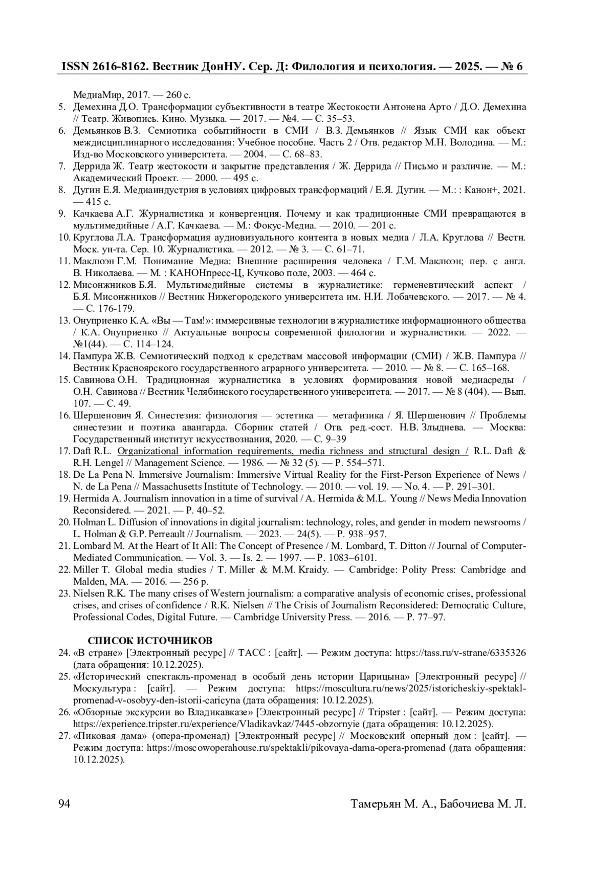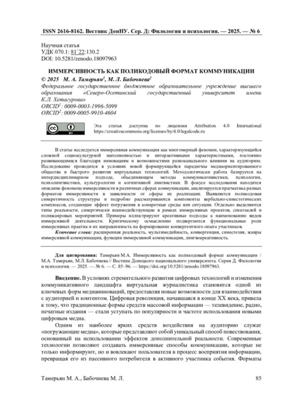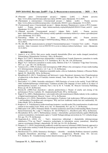 13. Онуприенко К.А. “Вы - Там!”: иммерсивные технологии в журналистике информационного общества / К.А. Онуприенко // Актуальные вопросы современной филологии и журналистики. - 2022. - №1(44). - С. 114-124.