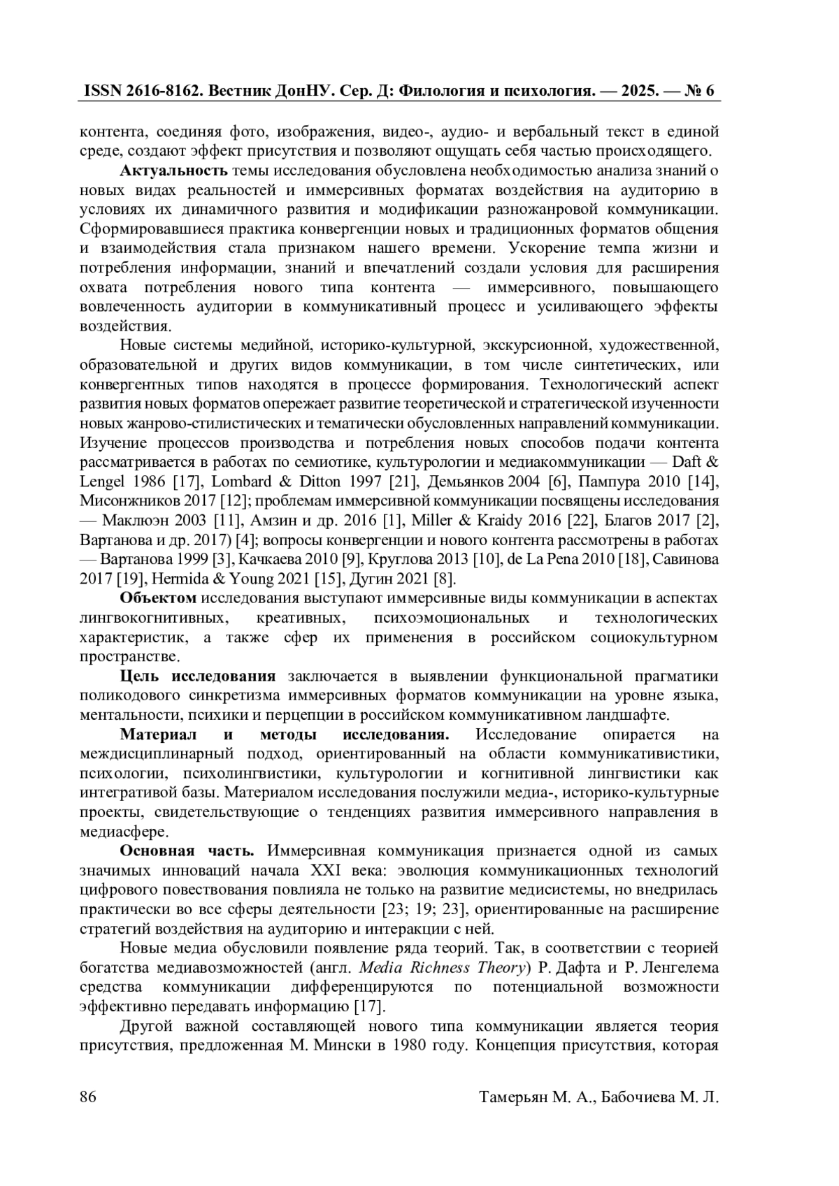 21. Lombard M. At the Heart of It All: The Concept of Presence / M. Lombard, T. Ditton // Journal of Computer-Mediated Communication. - Vol. 3. - Is. 2. - 1997. - P. 1083-6101.