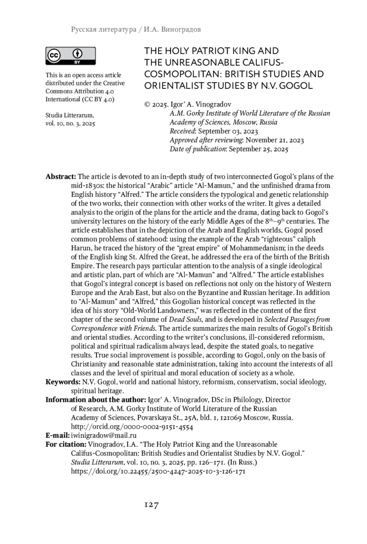Статья посвящена углубленному изучению двух взаимосвязанных замыслов Гоголя средины 1830-х гг.: исторической «арабской» статьи «Ал-Мамун» и незавершенной драмы из английской истории «Альфред». Рассматривается типологическое и генетическое родство двух произведений, их связь с другими сочинениями писателя. Детально анализируется зарождение замыслов статьи и драмы, восходящих к гоголевским университетским лекциям по истории раннего Средневековья VIII–IX вв. Устанавливается, что в изображении арабского и английского миров Гоголь ставил общие проблемы государственности: на примере арабского «праведного» халифа Гаруна прослеживал историю «великой империи» магометанства; в деяниях английского короля св. Альфреда Великого обращался к эпохе зарождения британской империи. Устанавливается, что в основе целостной концепции Гоголя лежат размышления не только над историей Западной Европы и арабского Востока, но и над византийским и русским наследием. Кроме «Ал-Мамуна» и «Альфреда», гоголевская историческая концепция сказалась в замысле его повести «Старосветские помещики», отразилась в содержании первой главы второго тома «Мертвых душ», развернута в «Выбранных местах из переписки с друзьями». Подводится главный итог британоведческих и ориенталистских штудий Гоголя. Согласно выводам писателя, непродуманное реформаторство, политический и духовный радикализм всегда приводят, несмотря на заявленные цели, к негативным результатам. Подлинное социальное совершенствование возможно, по Гоголю, лишь на почве христианства и разумного государственного управления, учитывающего интересы всех сословий.