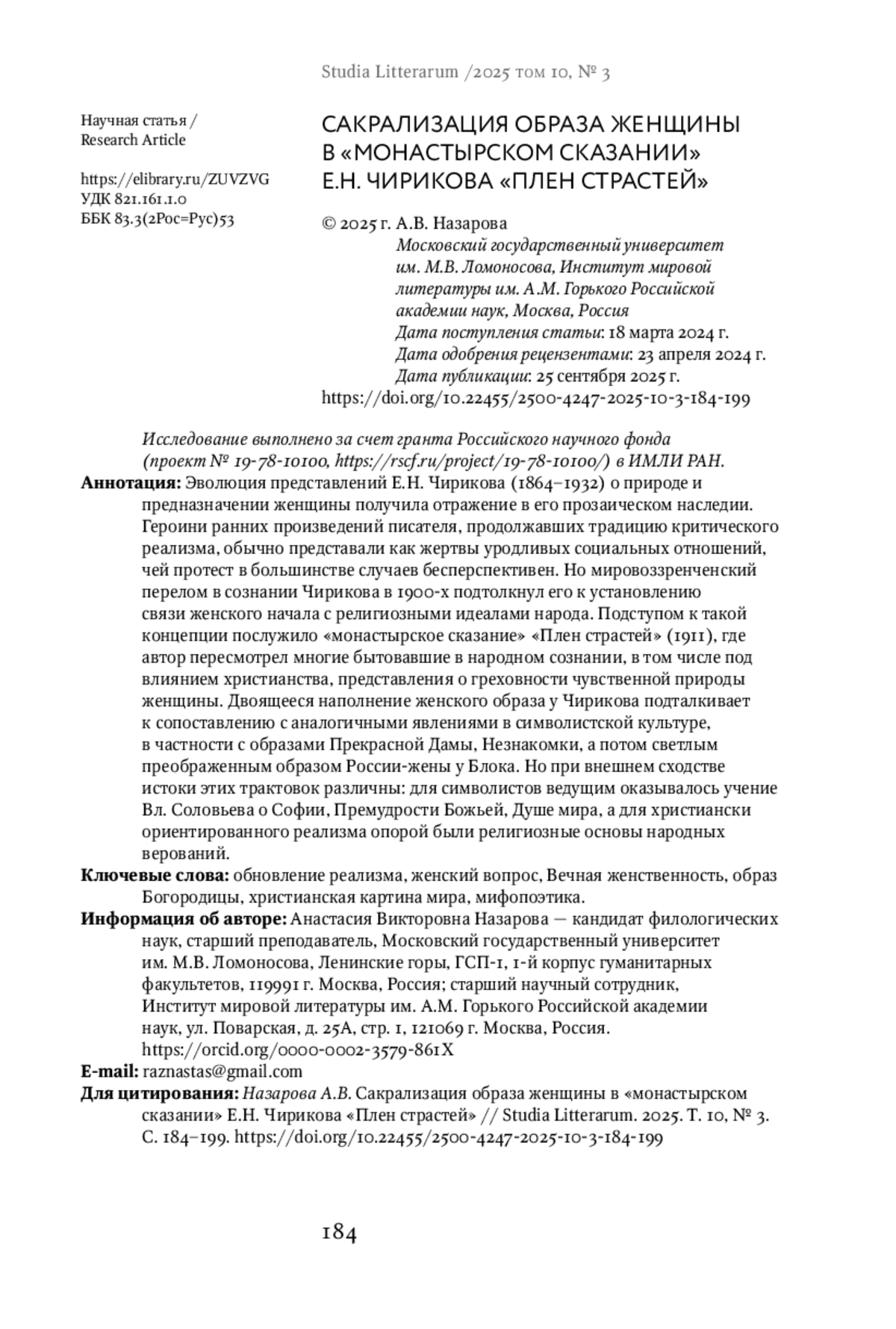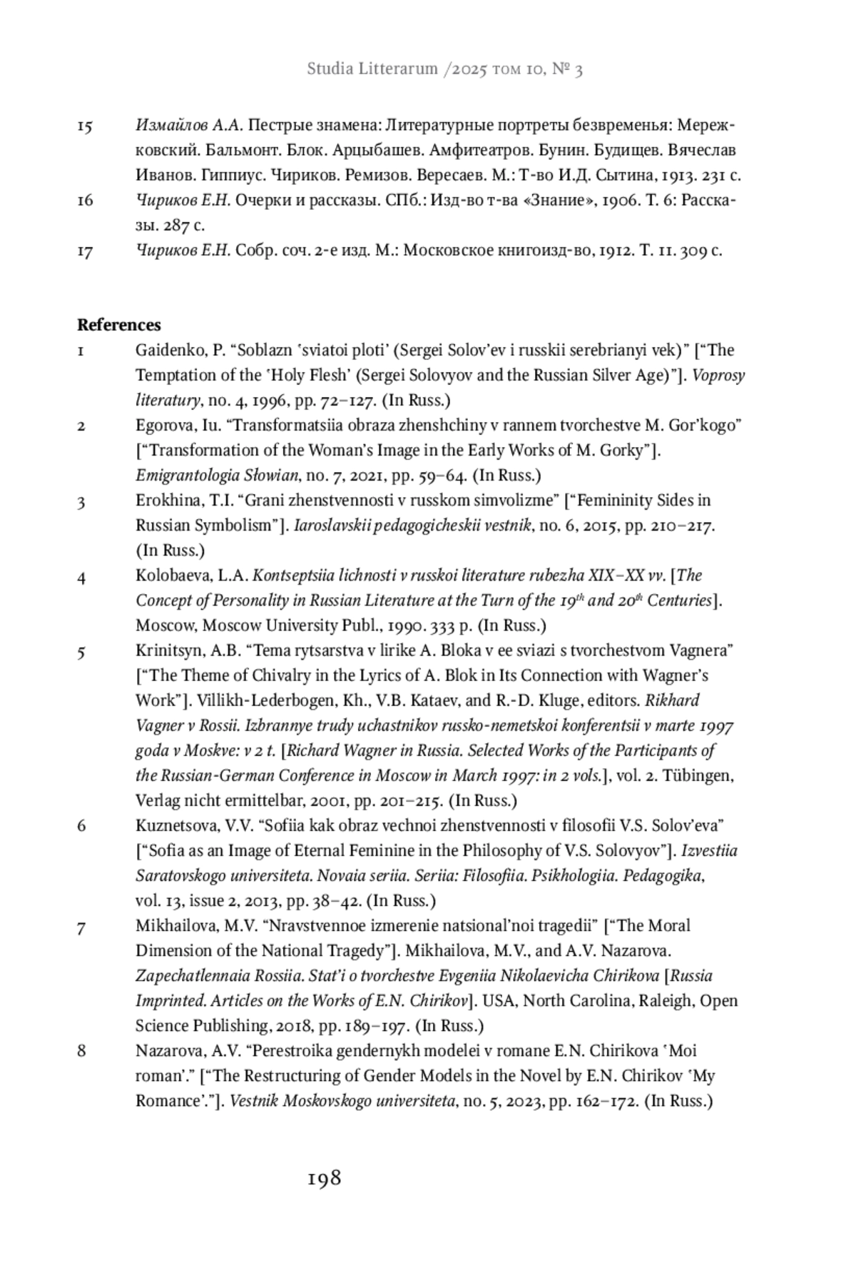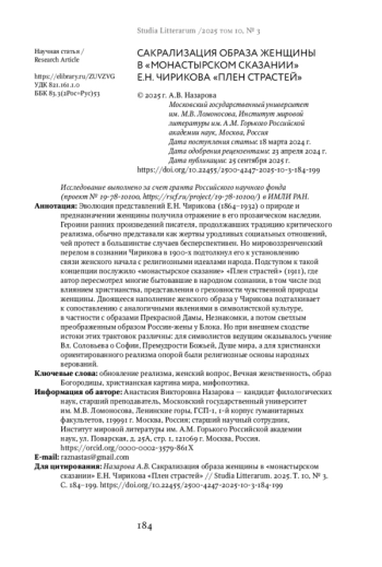 8. Назарова А.В. Перестройка гендерных моделей в романе Е.Н. Чирикова “Мой роман” // Вестник Московского университета. Серия 9. Филология. 2023. № 5. С. 162-172. EDN: ZEGZJD