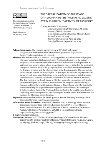 The evolution of E. N. Chirikov’s (1864–1932) ideas about the nature and purpose of women was reflected in his prose legacy. The female characters of the writer’s early works who continued the tradition of critical realism were usually presented as victims of ugly social relations whose protest in most cases is futile. But the ideological change in Chirikov’s mind in the 900s pushed him to establish a connection between the feminine principle and the religious ideals of the Russian people. The approach to such a concept was the “monastic legend” “Captivity of the Passions” (1911) where the author revised many ideas that existed in the popular consciousness including under the influence of Christianity about the sinfulness of the sensual nature of a woman. The dual content of the female image in Chirikov pushes for comparison with similar phenomena in symbolist culture in particular with the image of a Beautiful Lady, a Stranger and then the bright transformed image of Blok’s Russia-wife. But despite the external similarity the origins of these interpretations are different: the teaching of V. Solovyov about Sophia, the Wisdom of God, the Soul of the world is turned out to be the leading one for the symbolists, and the religious foundations of folk beliefs were the mainstay for Christian-oriented realism.