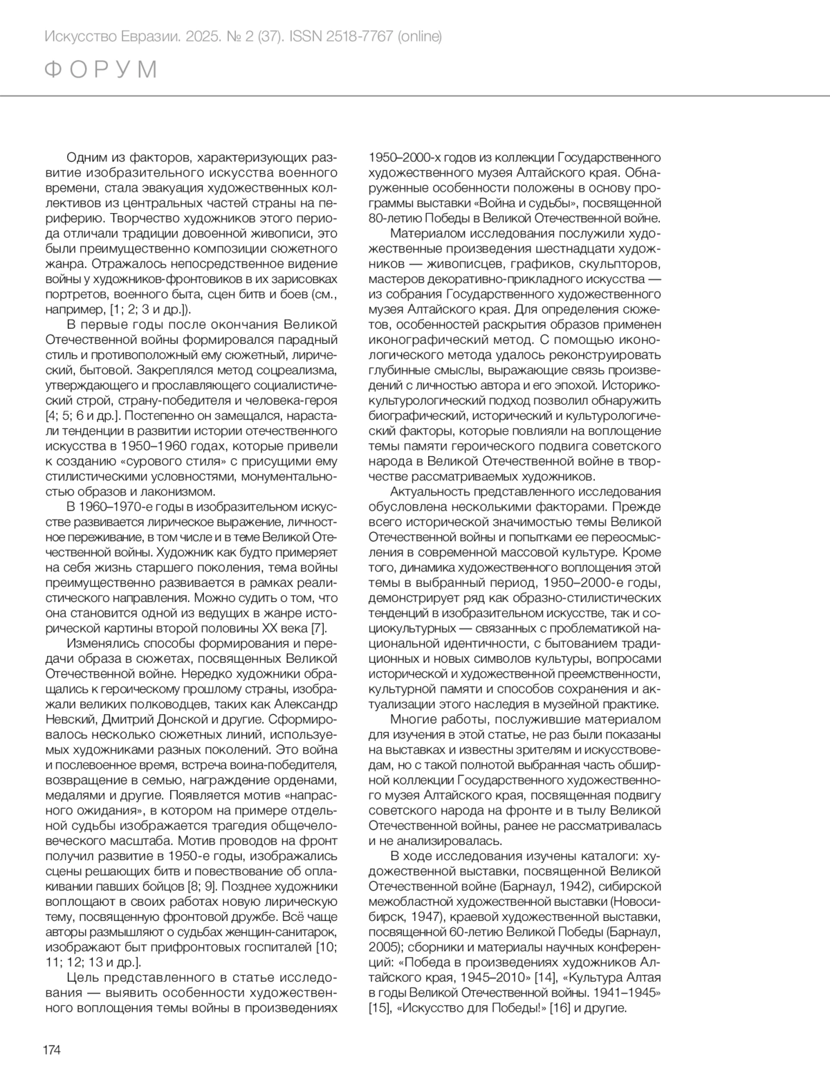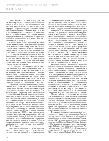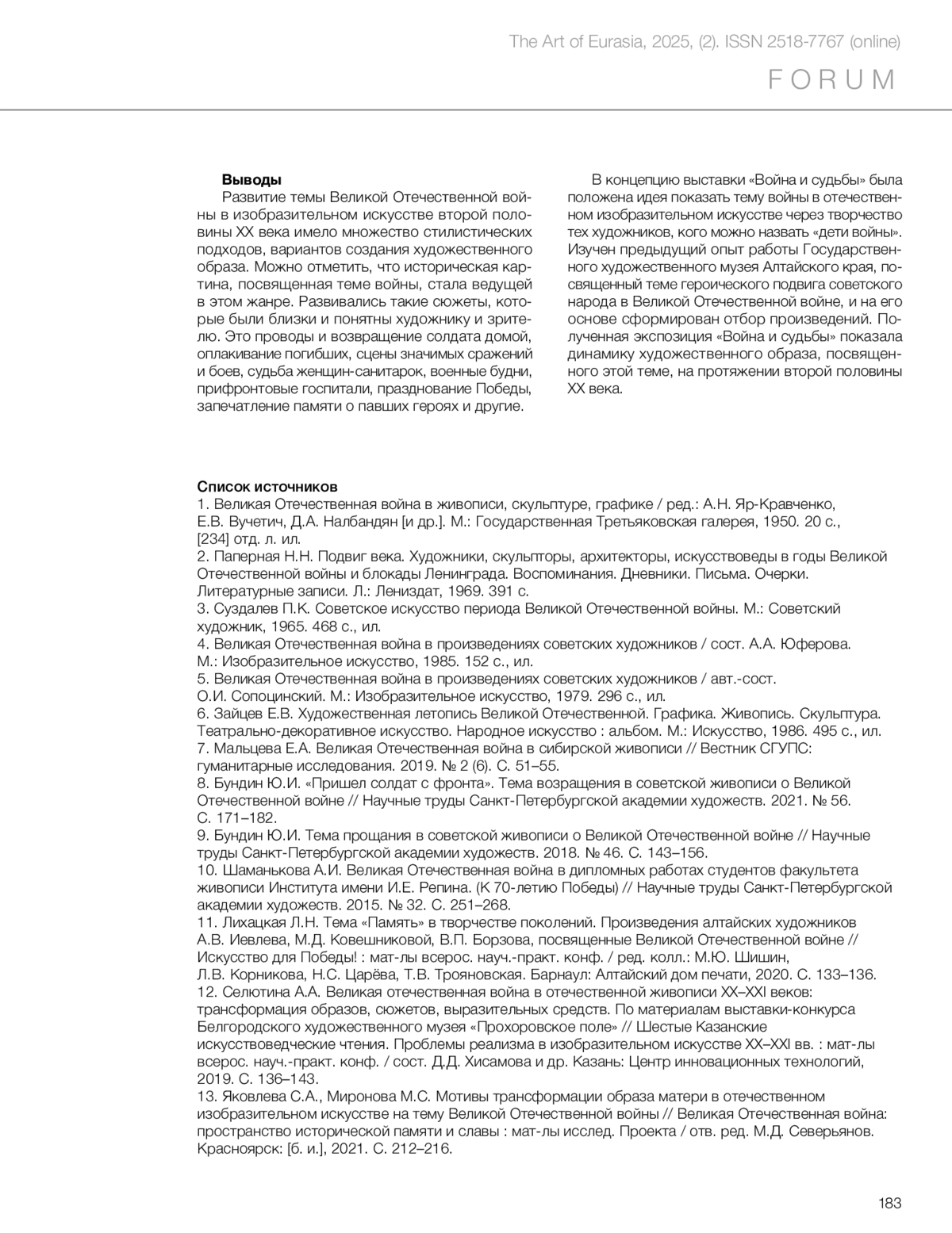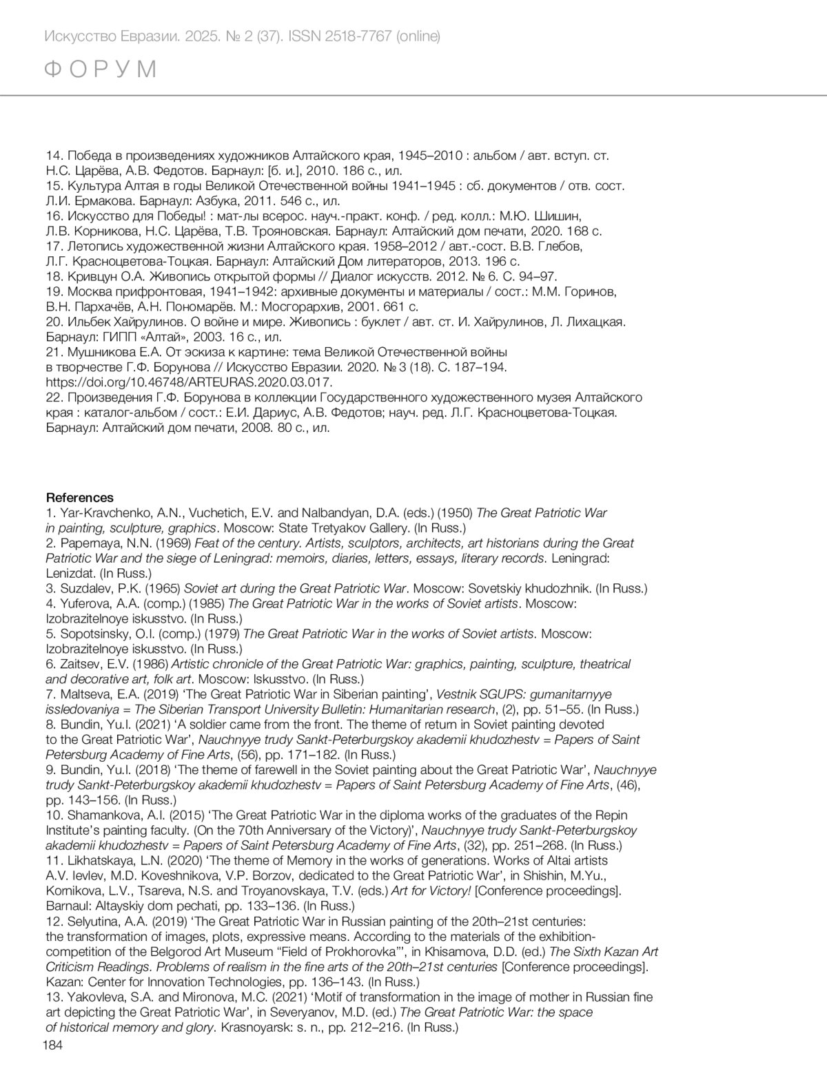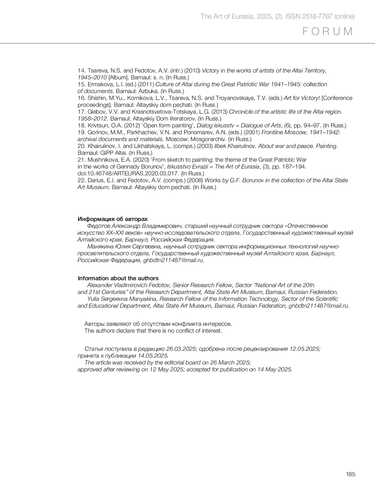 21. Mushnikova, E.A. (2020) ‘From sketch to painting: the theme of the Great Patriotic War in the works of Gennady Borunov’, *Iskusstvo Evrazii = The Art of Eurasia*, (3), pp. 187–194. doi:10.46748/ARTEURAS.2020.03.017. (In Russ.)