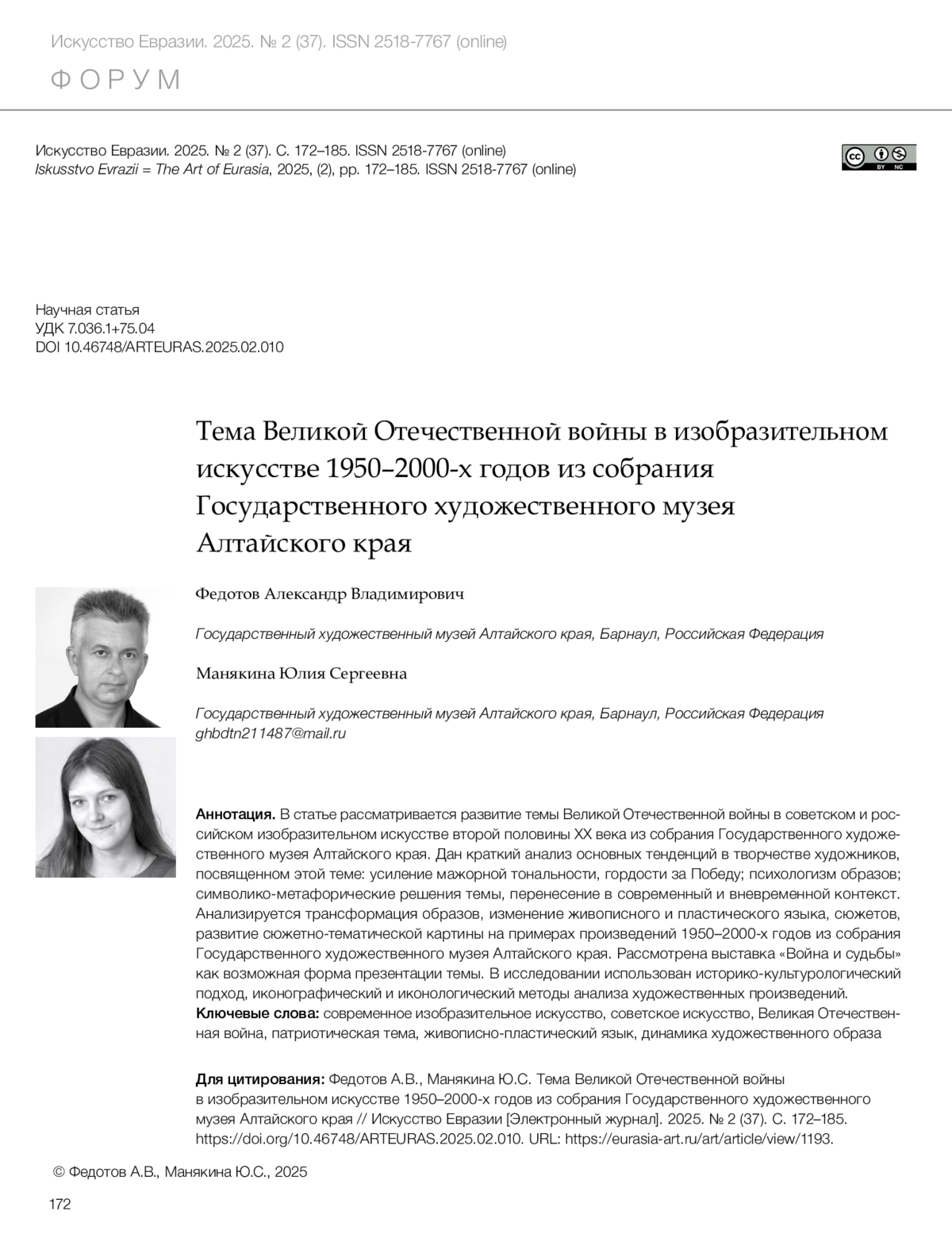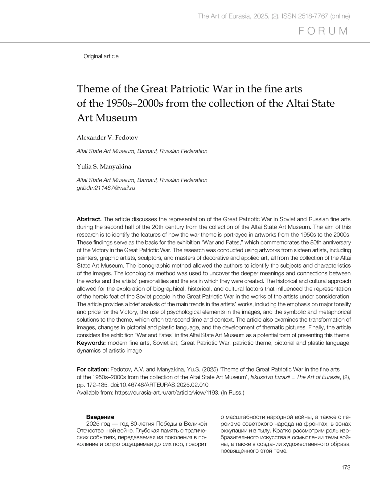 The article discusses the representation of the Great Patriotic War in Soviet and Russian fine arts during the second half of the 20th century from the collection of the Altai State Art Museum. The aim of this research is to identify the features of how the war theme is portrayed in artworks from the 1950s to the 2000s. These findings serve as the basis for the exhibition “War and Fates,” which commemorates the 80th anniversary of the Victory in the Great Patriotic War. The research was conducted using artworks from sixteen artists, including painters, graphic artists, sculptors, and masters of decorative and applied art, all from the collection of the Altai State Art Museum. The iconographic method allowed the authors to identify the subjects and characteristics of the images. The iconological method was used to uncover the deeper meanings and connections between the works and the artists’ personalities and the era in which they were created. The historical and cultural approach allowed for the exploration of biographical, historical, and cultural factors that influenced the representation of the heroic feat of the Soviet people in the Great Patriotic War in the works of the artists under consideration. The article provides a brief analysis of the main trends in the artists’ works, including the emphasis on major tonality and pride for the Victory, the use of psychological elements in the images, and the symbolic and metaphorical solutions to the theme, which often transcend time and context. The article also examines the transformation of images, changes in pictorial and plastic language, and the development of thematic pictures. Finally, the article considers the exhibition “War and Fates” in the Altai State Art Museum as a potential form of presenting this theme.