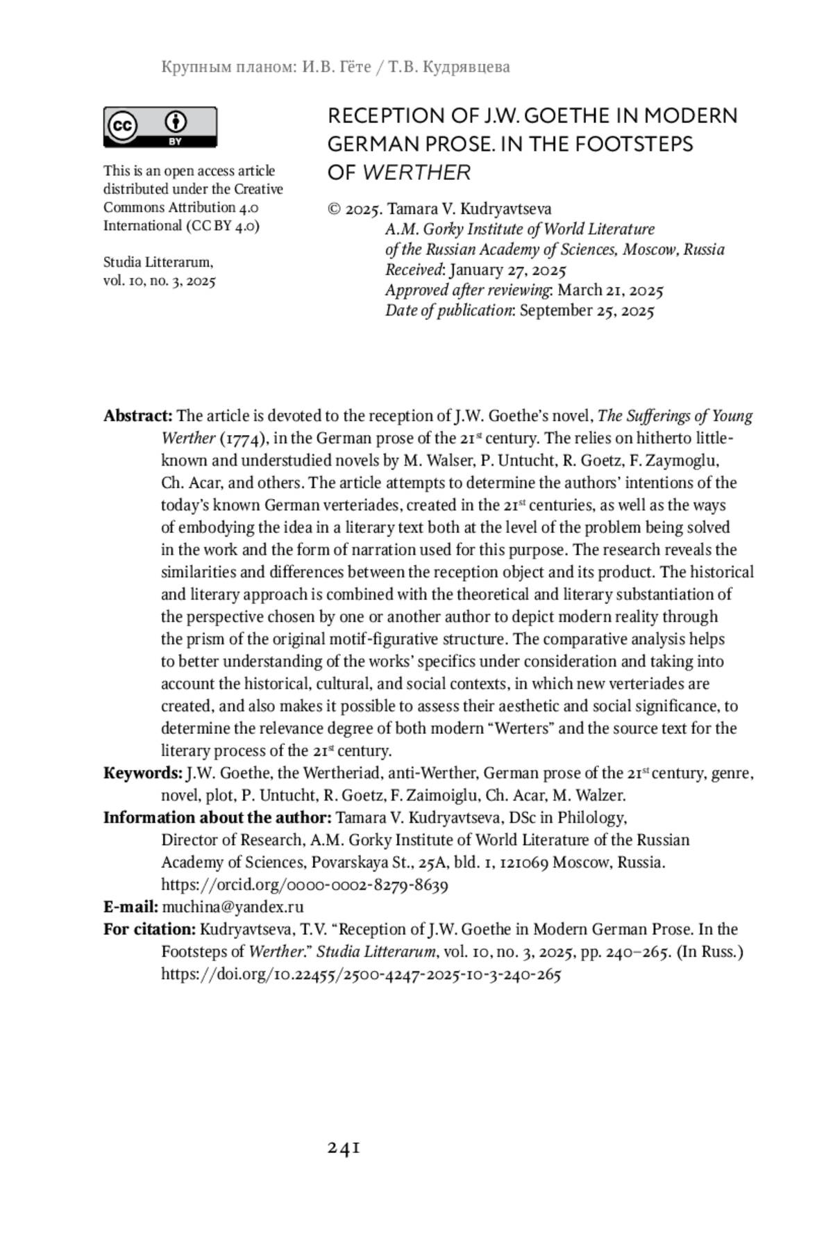 The article is devoted to the reception of J. W. Goethe’s novel, The Sufferings of Young Werther (1774), in the German prose of the 21st century. The relies on hitherto littleknown and understudied novels by M. Walser, P. Untucht, R. Goetz, F. Zaymoglu, Ch. Acar, and others. The article attempts to determine the authors’ intentions of the today’s known German verteriades, created in the 21st centuries, as well as the ways of embodying the idea in a literary text both at the level of the problem being solved in the work and the form of narration used for this purpose. The research reveals the similarities and differences between the reception object and its product. The historical and literary approach is combined with the theoretical and literary substantiation of the perspective chosen by one or another author to depict modern reality through the prism of the original motif-figurative structure. The comparative analysis helps to better understanding of the works’ specifics under consideration and taking into account the historical, cultural, and social contexts, in which new verteriades are created, and also makes it possible to assess their aesthetic and social significance, to determine the relevance degree of both modern “Werters” and the source text for the literary process of the 21st century.