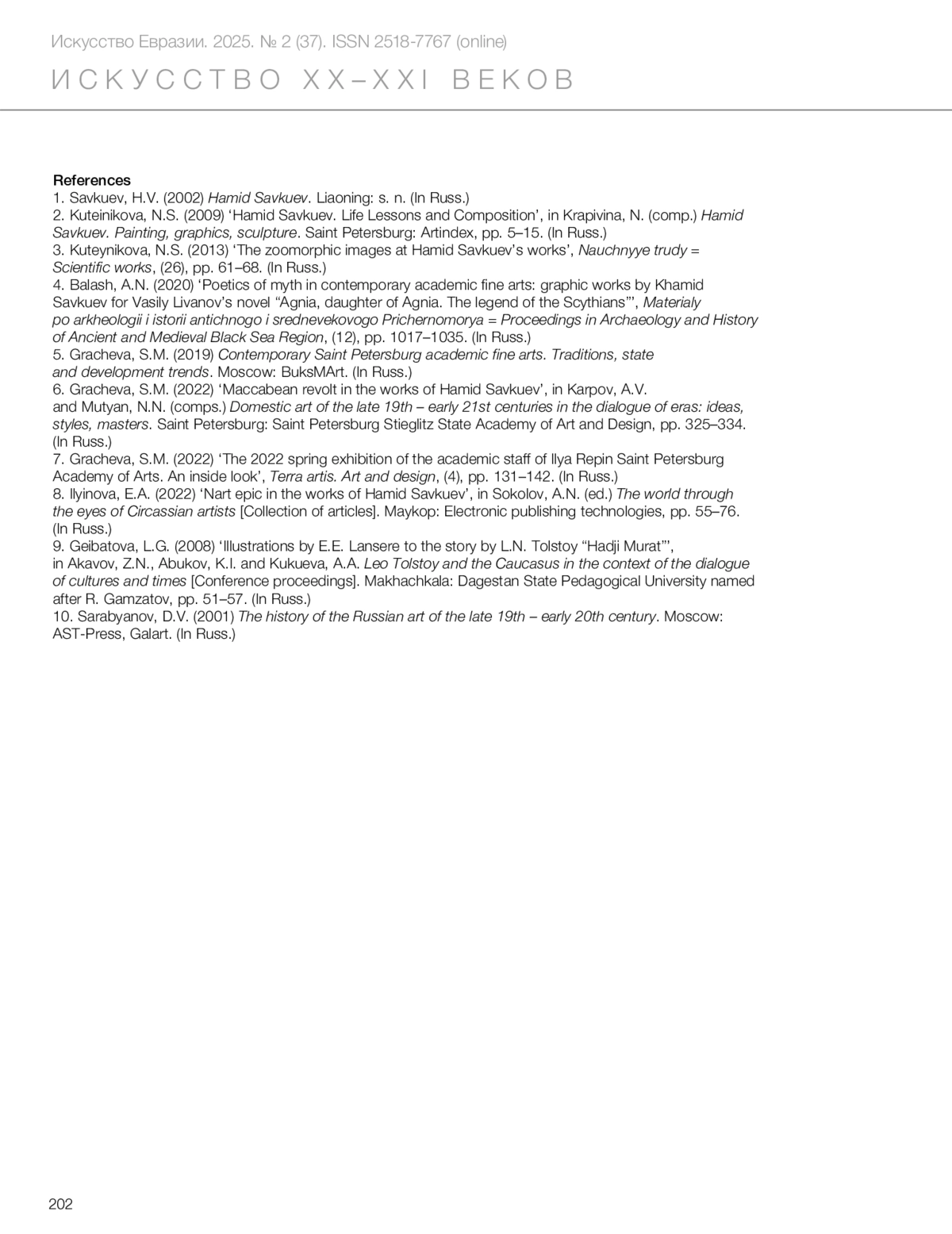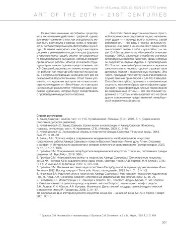 2. Kuteinikova, N.S. (2009) ‘Hamid Savkuev. Life Lessons and Composition’, in Krapivina, N. (comp.) *Hamid Savkuev. Painting, graphics, sculpture*. Saint Petersburg: Artindex, pp. 5–15. (In Russ.)