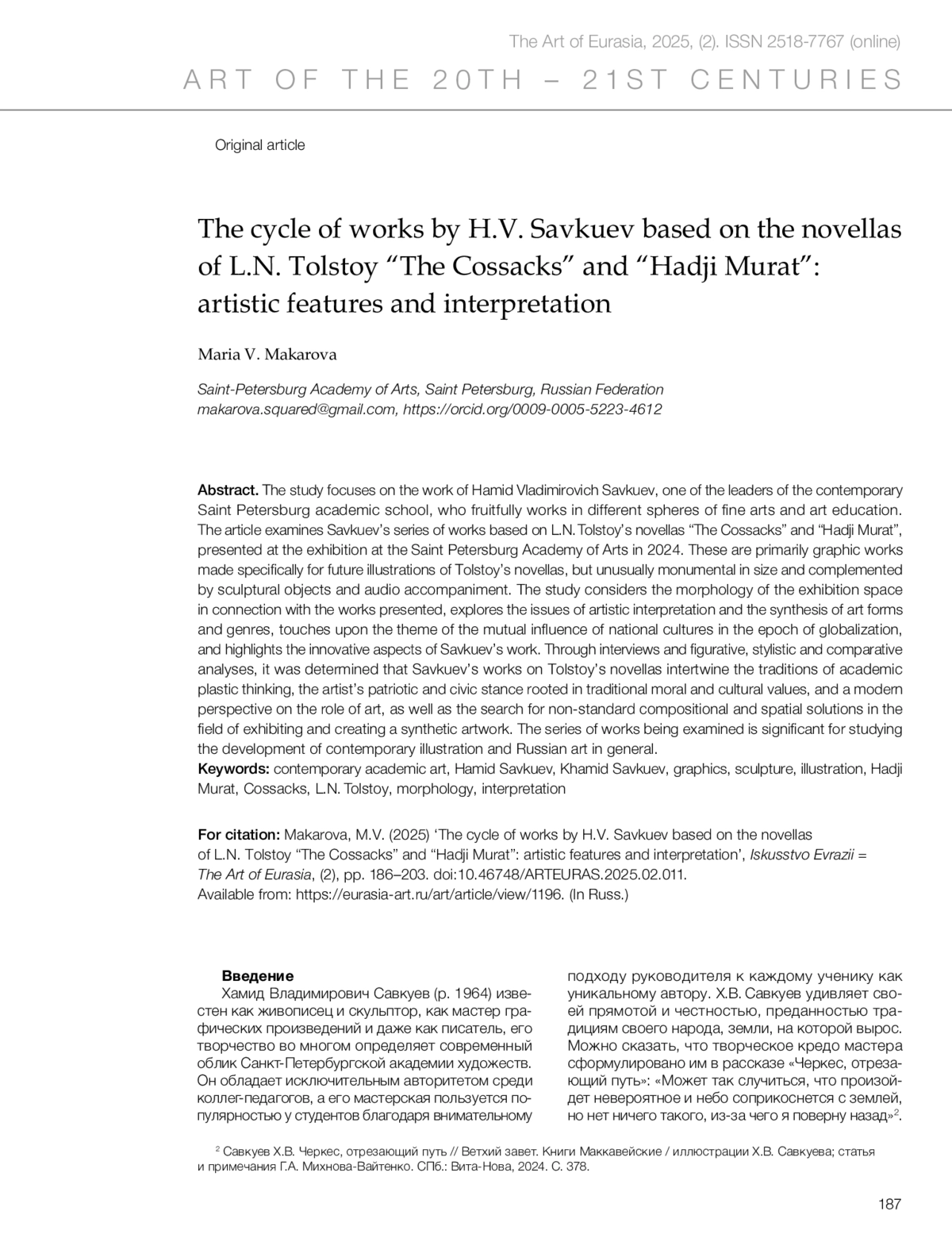 Исследование посвящено творчеству Хамида Владимировича Савкуева, одного из лидеров современной петербургской академической школы, который плодотворно трудится в разных сферах изобразительного искусства и художественного образования. В статье впервые рассматривается цикл произведений Х. В. Савкуева по произведениям Л. Н. Толстого «Казаки» и «Хаджи-Мурат», представленный на выставке в Санкт-Петербургской академии художеств в 2024 году. Это прежде всего графические работы, выполненные специально для будущих иллюстраций повестей Толстого, но необычно монументального размера и дополненные скульптурными объектами и аудиосопровождением. В исследовании рассматривается морфология выставочного пространства в связи с представленными произведениями, поднимаются проблемы художественной интерпретации, синтеза разных видов и жанров искусства, затрагивается тема взаимовлияния национальных культур в условиях современной глобализации, а также раскрываются новаторские черты творчества известного петербургского художника. В результате интервьюирования, а также образно-стилистического и сравнительного анализа произведений определено, что в работах Х. В. Савкуева по произведениям Л. Н. Толстого «Казаки» и «Хаджи-Мурат» переплетаются традиции академического пластического мышления, патриотическая и гражданская позиция художника, основанная на традиционных нравственных и культурных ценностях, с современным взглядом на задачи искусства, поиск нестандартных композиционных и пространственных решений в области экспонирования произведений и создания синтетического художественного образа, ориентированного на откровенный разговор со зрителем. Рассматриваемый цикл произведений значим для изучения процессов развития как современной иллюстрации, так и российского искусства в целом.